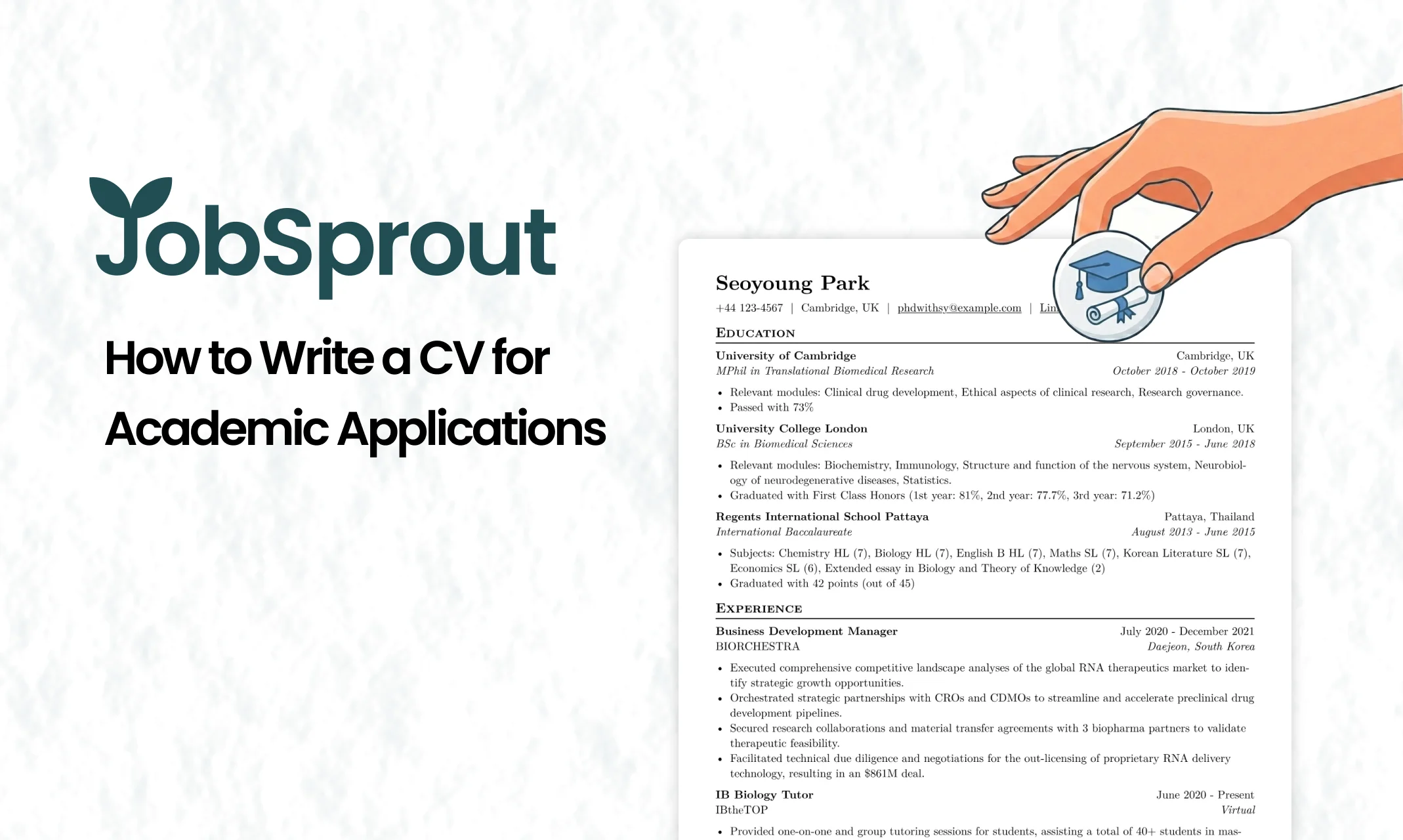 JobSprout is designed to help you create professional CVs for academic applications. Here is how our tools can help with your PhD, postdoc, or faculty application: