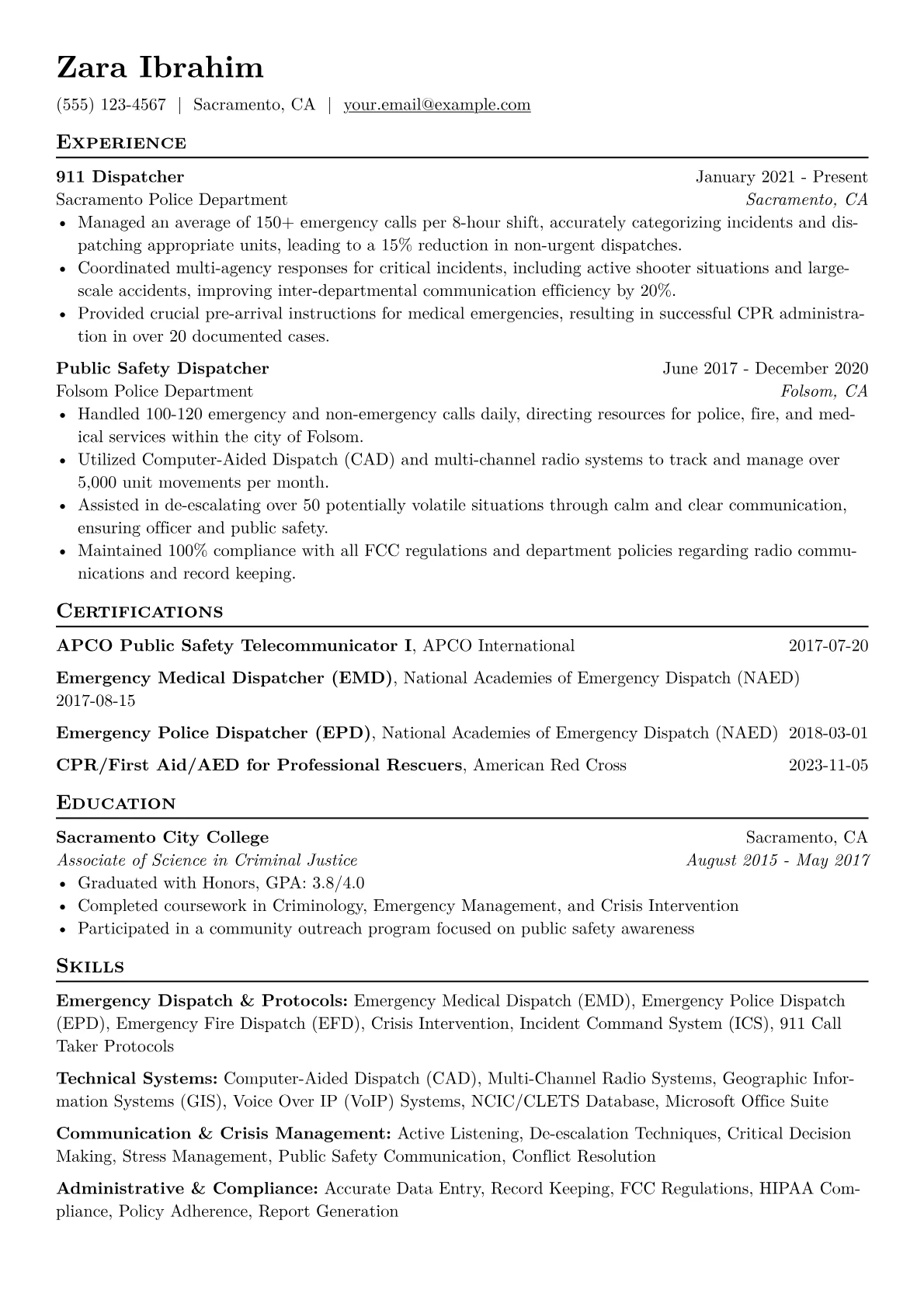 This effective template was built with JobSprout's intuitive tools and can be remixed to create your own compelling 911 Dispatcher resume.