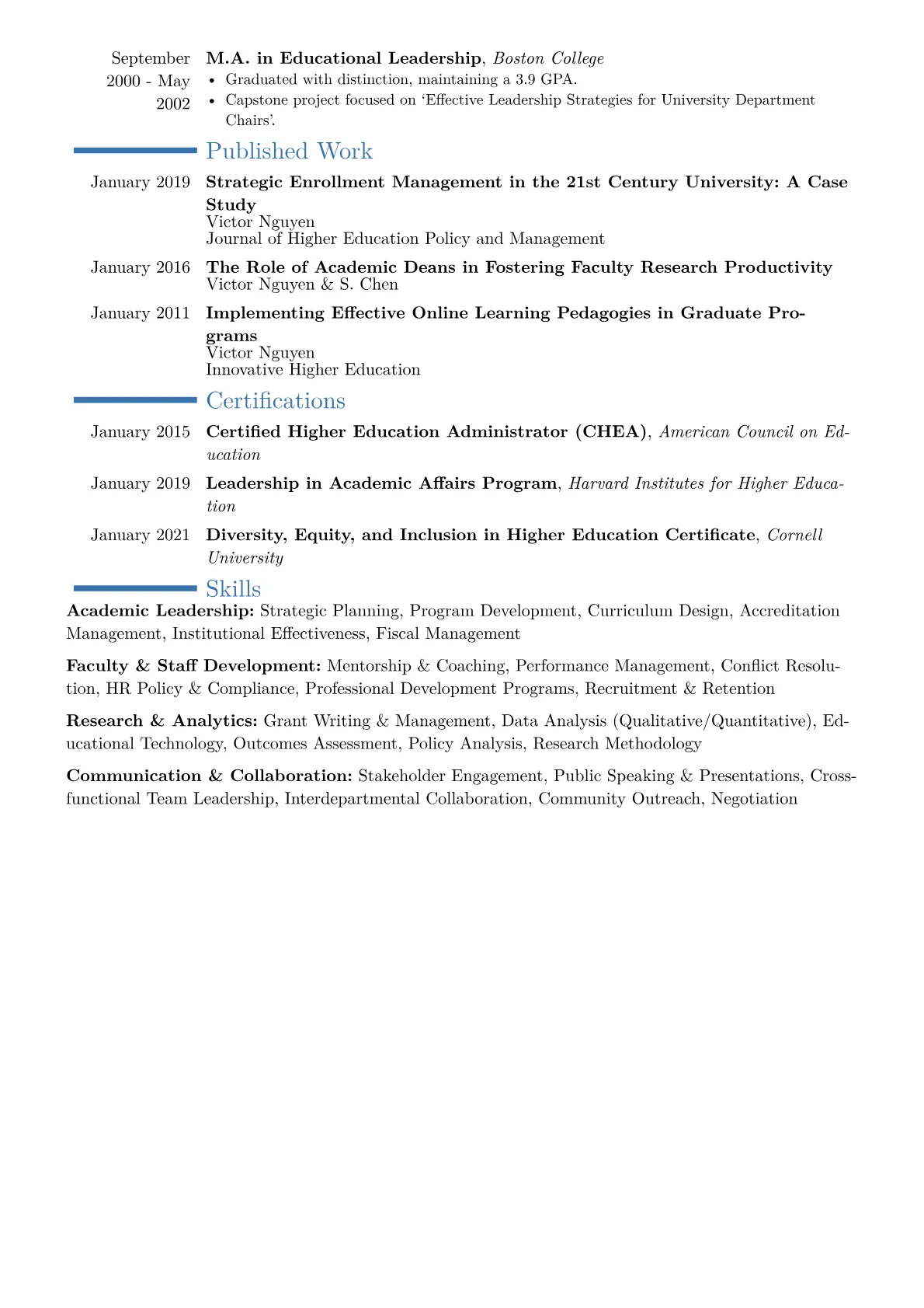 This example resume effectively highlights the extensive experience required for an Academic Dean. It meticulously quantifies achievements, such as "orchestrated a 15% increase in STEM program enrollment" and "secured over $2M in research grants." Strategic skills are clearly grouped under headings like "Academic Administration" and "Institutional Advancement," reflecting the multifaceted nature of the role. The inclusion of specific tools, for example, proficiency in learning management systems like Canvas and experience with institutional analytics platforms, provides concrete evidence of operational capability beyond just leadership.