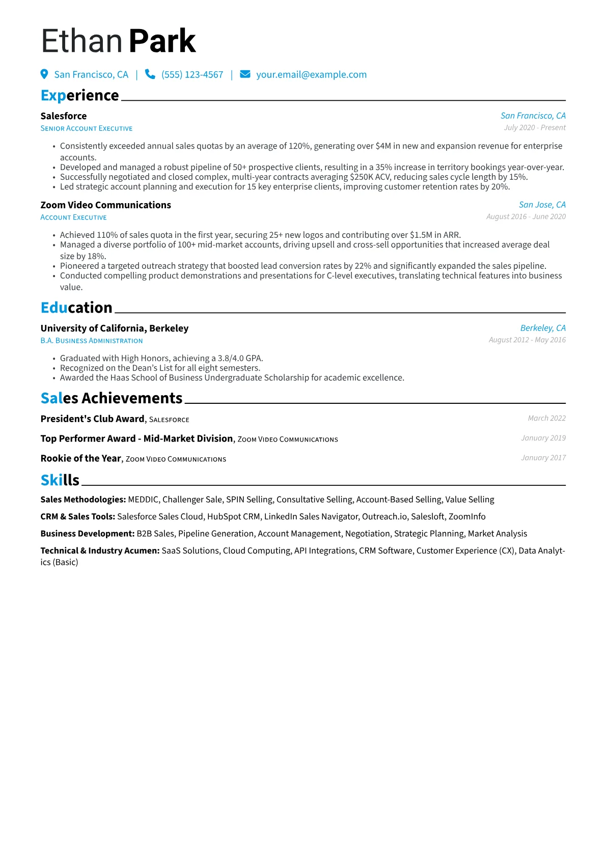 This example CV effectively showcases these critical elements. Achievements are consistently quantified, highlighting revenue generated and quota attainment figures that resonate with tech sales leaders. Skills are thoughtfully grouped into categories like "CRM & Sales Tools" (e.g., Salesforce, Outreach.io) and "Sales Methodologies" (e.g., MEDDIC, Challenger Sale), making it easy to scan for technical proficiency. Specific certifications and tools are highlighted prominently, demonstrating a practical command of the sales ecosystem essential for a Technology Account Executive.