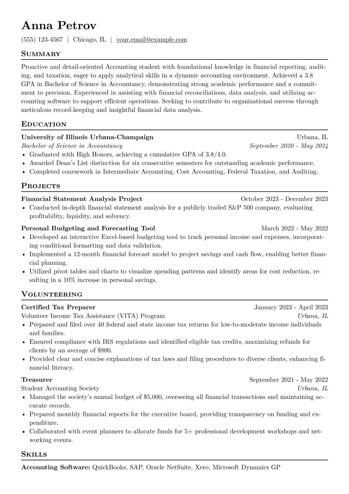 The JobSprout Accounting Intern example effectively showcases these elements through its structure. Achievements are consistently quantified, illustrating impact rather than just responsibilities. Skills are logically grouped into categories like "Financial Software," "Data Analysis," and "Compliance," making it easy for recruiters to identify key competencies. Important tools such as QuickBooks, SAP, and advanced Excel functions are prominently featured, as is any progress towards certifications like the CPA, signaling commitment to the field.