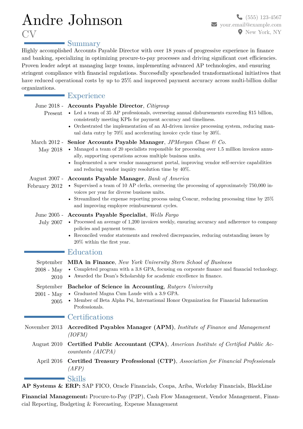 This template was built with JobSprout and can be remixed to create your own tailored Accounts Payable Director resume.