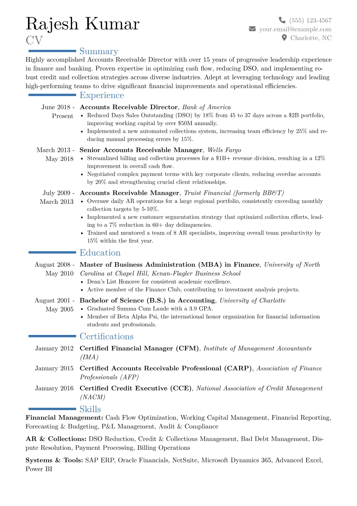 The example CV excels by concretely quantifying these high-level achievements, for instance, detailing "Reduced average DSO by 18% across a $500M portfolio" or "Enhanced cash recovery rates by 25% through strategic negotiation frameworks." Skills are thoughtfully grouped into relevant categories such as "Strategic Financial Planning," "Credit & Collections Management," and "System Implementation & Optimization," providing a clear overview of multifaceted capabilities. Specific certifications and tools, like CPA designation or mastery of HighRadius and BlackLine, are prominently featured, immediately signaling industry-specific proficiency.