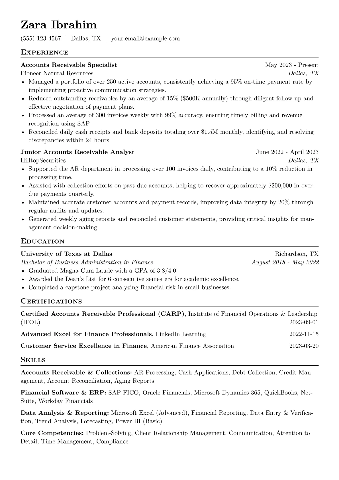 A strong Accounts Receivable Specialist resume for finance and banking emphasizes precision, diligence, and a knack for reducing Days Sales Outstanding (DSO). Hiring managers seek candidates who demonstrate proficiency in reconciliation, collections, and relevant accounting software, understanding the critical role AR plays in cash flow. The unique challenge lies in effectively managing high invoice volumes while ensuring timely payments and accurate reporting.