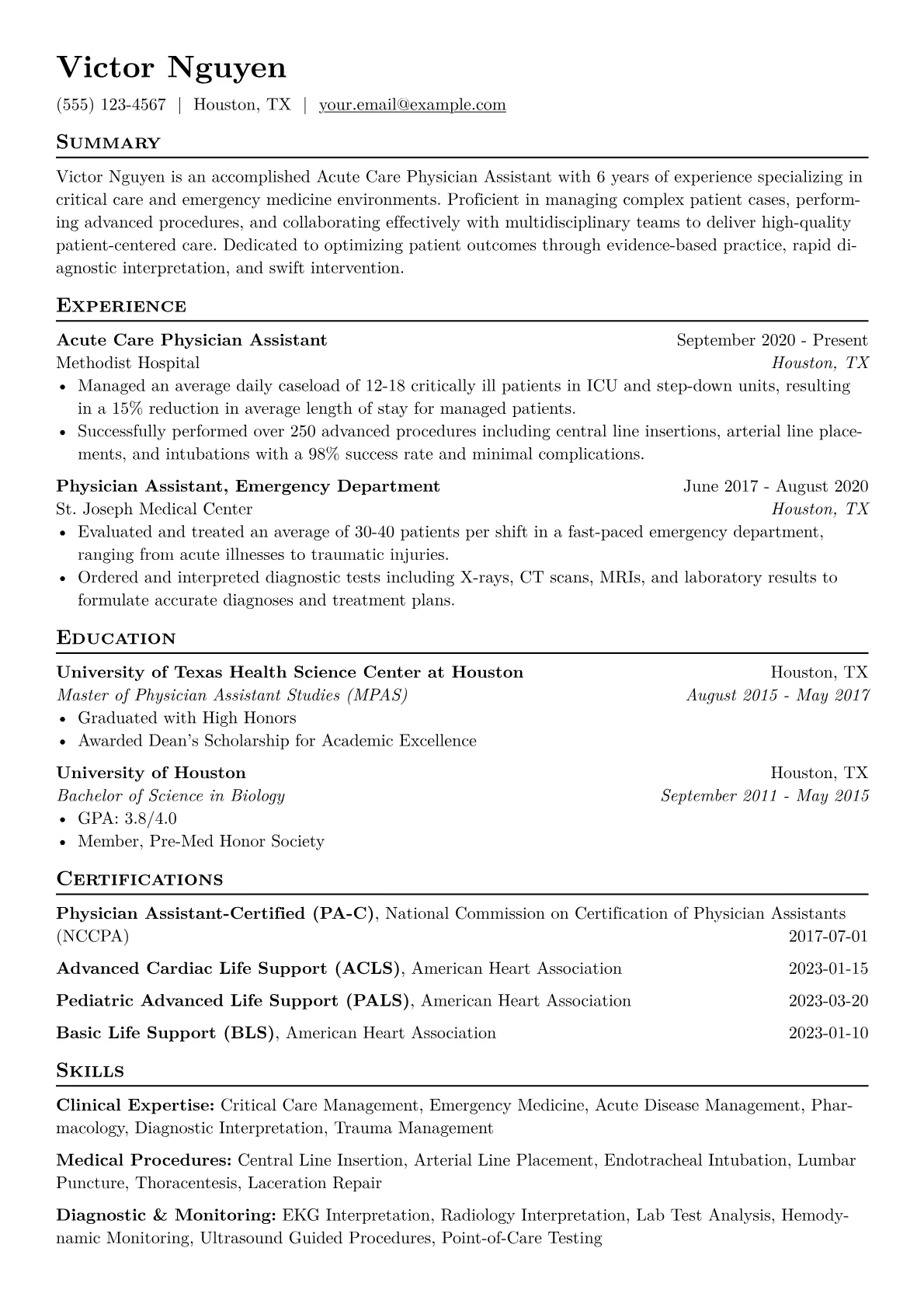 This example resume effectively structures information to highlight an Acute Care PA's core strengths. Clinical accomplishments are quantified precisely, such as specifying the average number of high-acuity patients seen daily or the volume of procedures performed, like suturing or line placements. Skills are logically grouped, separating advanced medical procedures from technical proficiencies in various EMRs. Crucially, certifications like NCCPA, ACLS, and PALS are presented clearly, assuring recruiters of immediate clinical readiness.