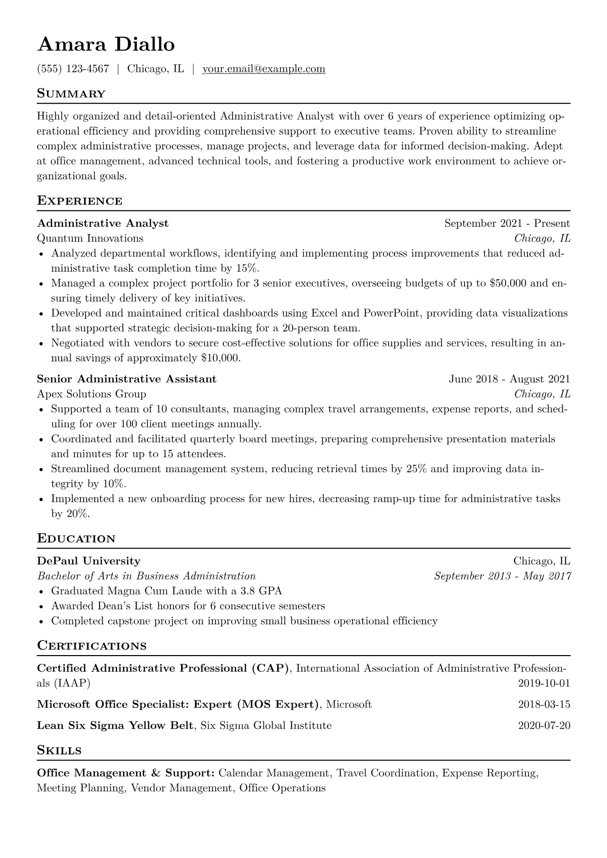 For an Administrative Analyst in diverse sectors, hiring managers seek demonstrated aptitude for operational efficiency, data integrity, and stakeholder engagement. This role demands more than just support; it requires a proactive approach to process optimization, resource allocation, and risk mitigation. Concrete achievements like streamlining report generation by 25%, managing complex vendor contracts, or supporting compliance audits with high success rates are crucial. Highlighting certifications such as Lean Six Sigma Yellow Belt or proficiency in advanced Excel and SharePoint administration signifies specialized capability.