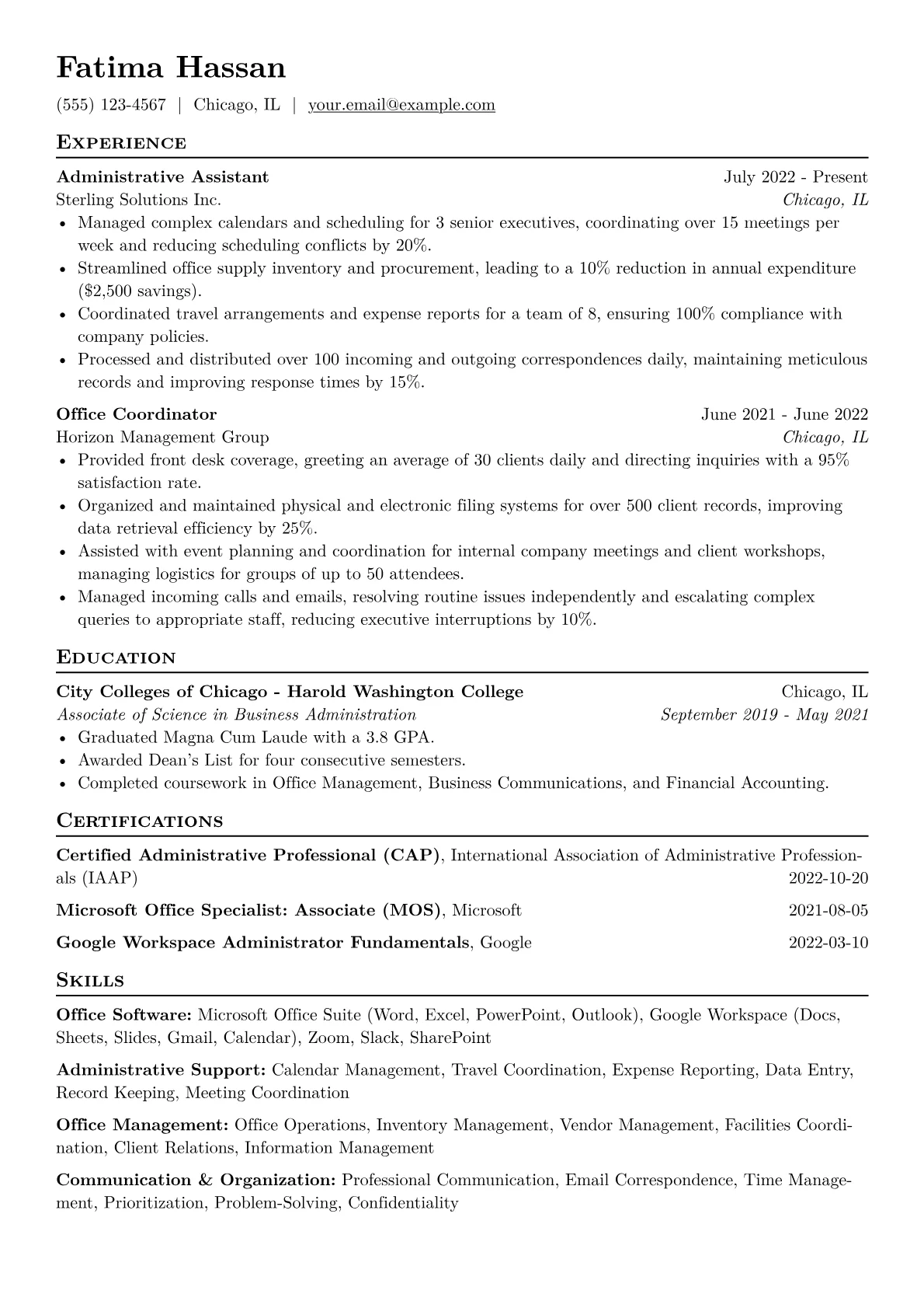 For entry-level Administrative Assistant roles, hiring managers seek more than just basic clerical skills; they prioritize proactive support, meticulous organization, and strong communication. Within "Other" industries, the ability to adapt to diverse workflows and manage varied responsibilities is crucial. Concrete achievements like streamlining information flow, improving data accuracy through precise record keeping, or effectively coordinating complex schedules demonstrate immediate value. Proficiency in common office software suites, such as Microsoft Office or Google Workspace, is expected, with any relevant certifications like Microsoft Office Specialist (MOS) adding significant weight.