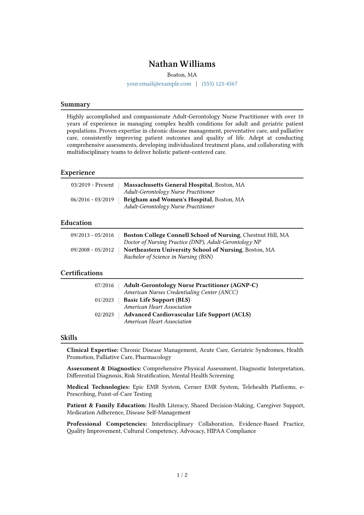This example CV excels by structuring content to immediately demonstrate the Nurse Practitioner’s value. Quantified achievements clearly illustrate patient outcomes, for instance, reducing hospitalizations by 15% through optimized care plans. Clinical skills are logically grouped, separating diagnostic abilities from patient education or leadership roles, making the breadth of experience easily digestible. Furthermore, specialized certifications and fluency in EMR systems are prominently featured, assuring recruiters of both clinical credentialing and technological proficiency relevant to modern healthcare settings.