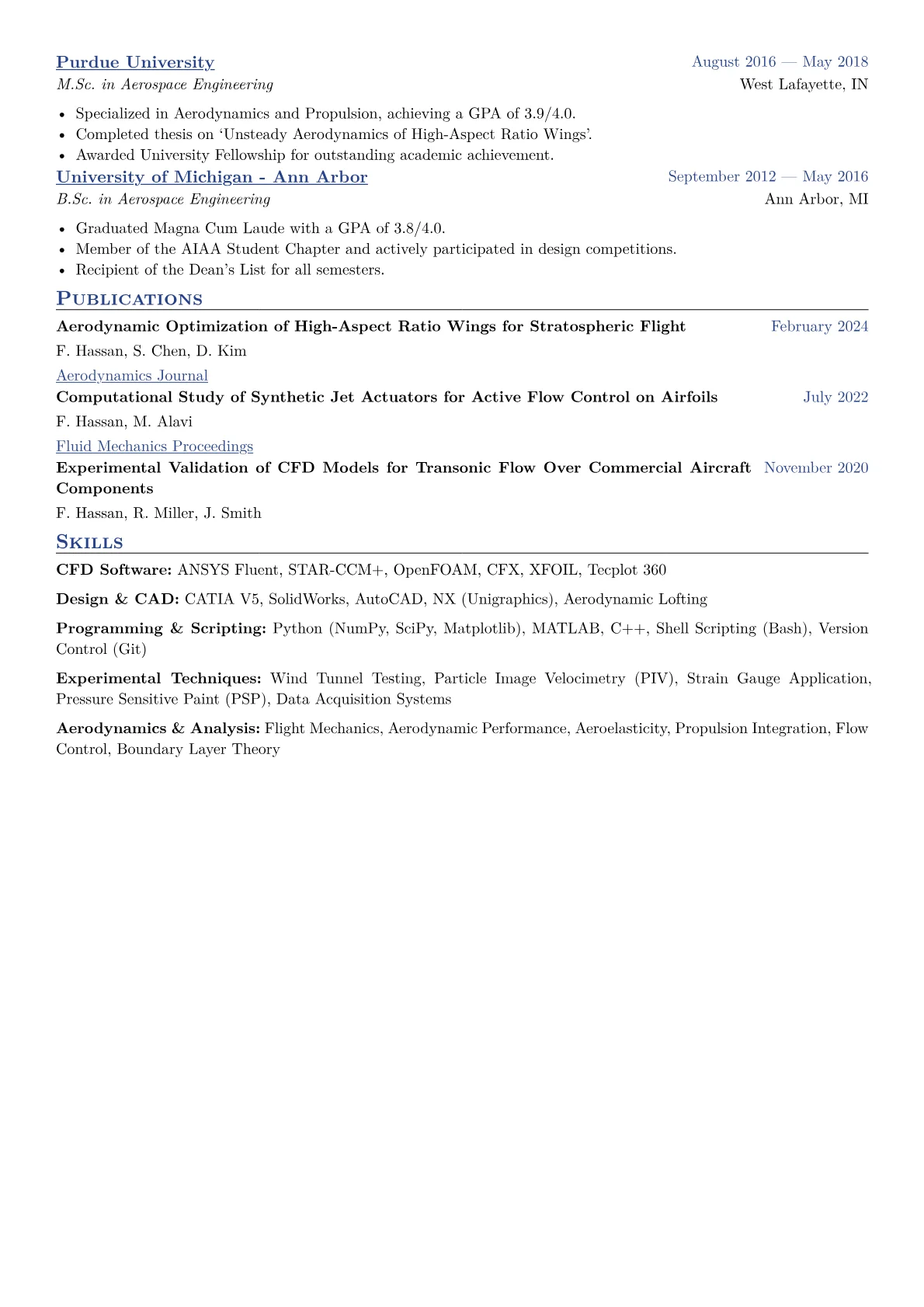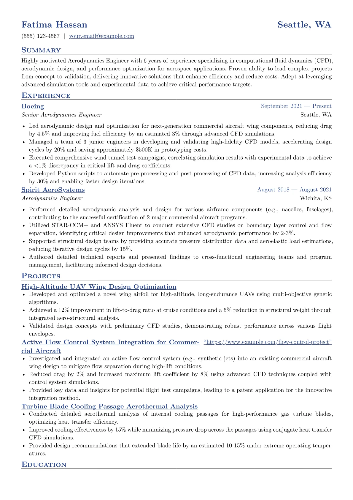 This example CV effectively highlights an Aerodynamics Engineer's capabilities. It quantifies achievements clearly, for instance, detailing how aerodynamic design improvements led to measurable gains in energy efficiency or product lifespan. Technical proficiencies, including specific CFD packages, CAD tools, and programming languages like MATLAB, are prominently grouped, allowing recruiters to quickly assess software familiarity. Crucially, the resume features direct references to contributions in product development cycles and problem-solving, rather than merely listing responsibilities.