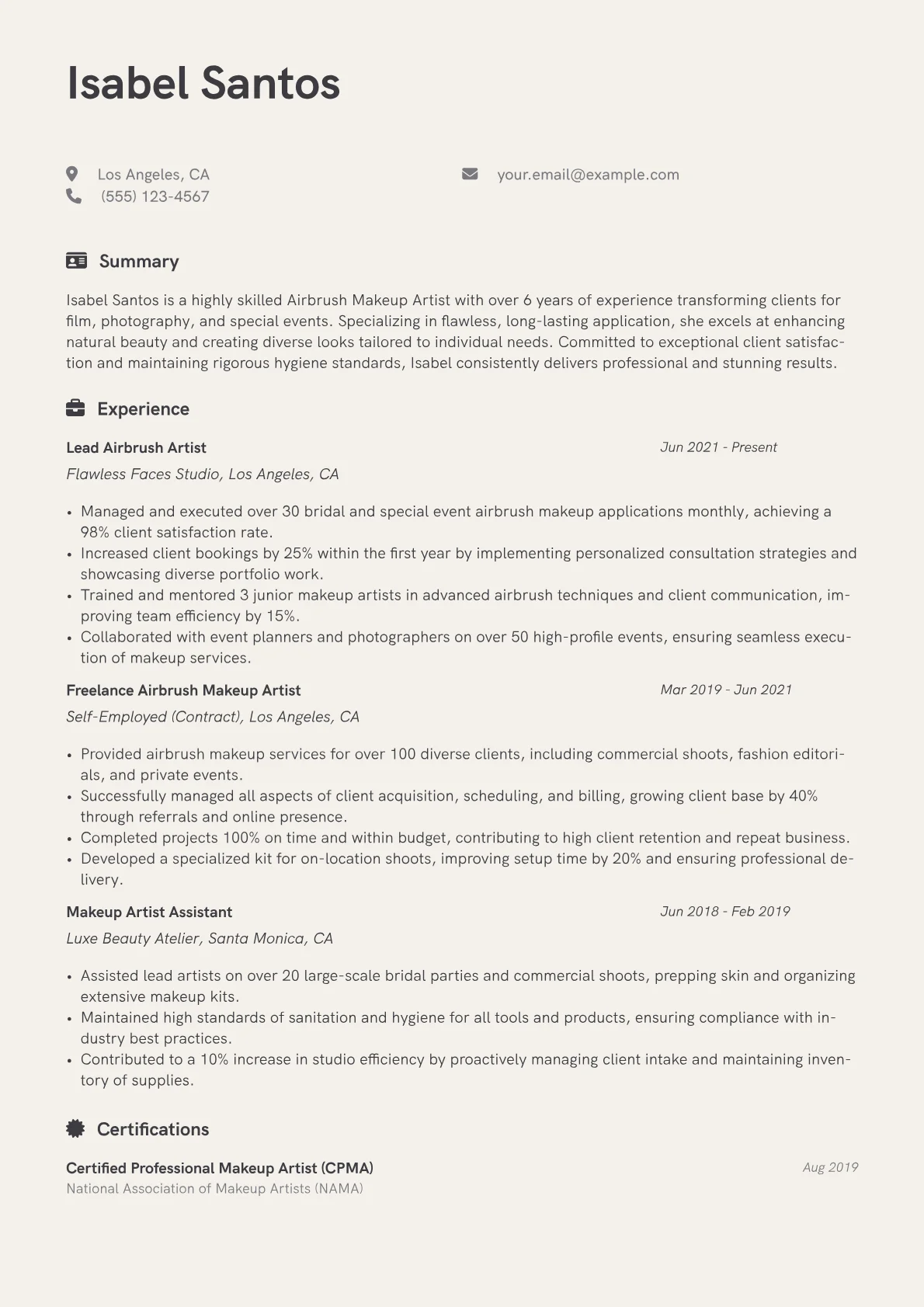 This template was built with JobSprout and offers a comprehensive structure for crafting a compelling Airbrush Makeup Artist resume. It can be easily remixed to create your own tailored application, emphasizing your unique experience and qualifications.