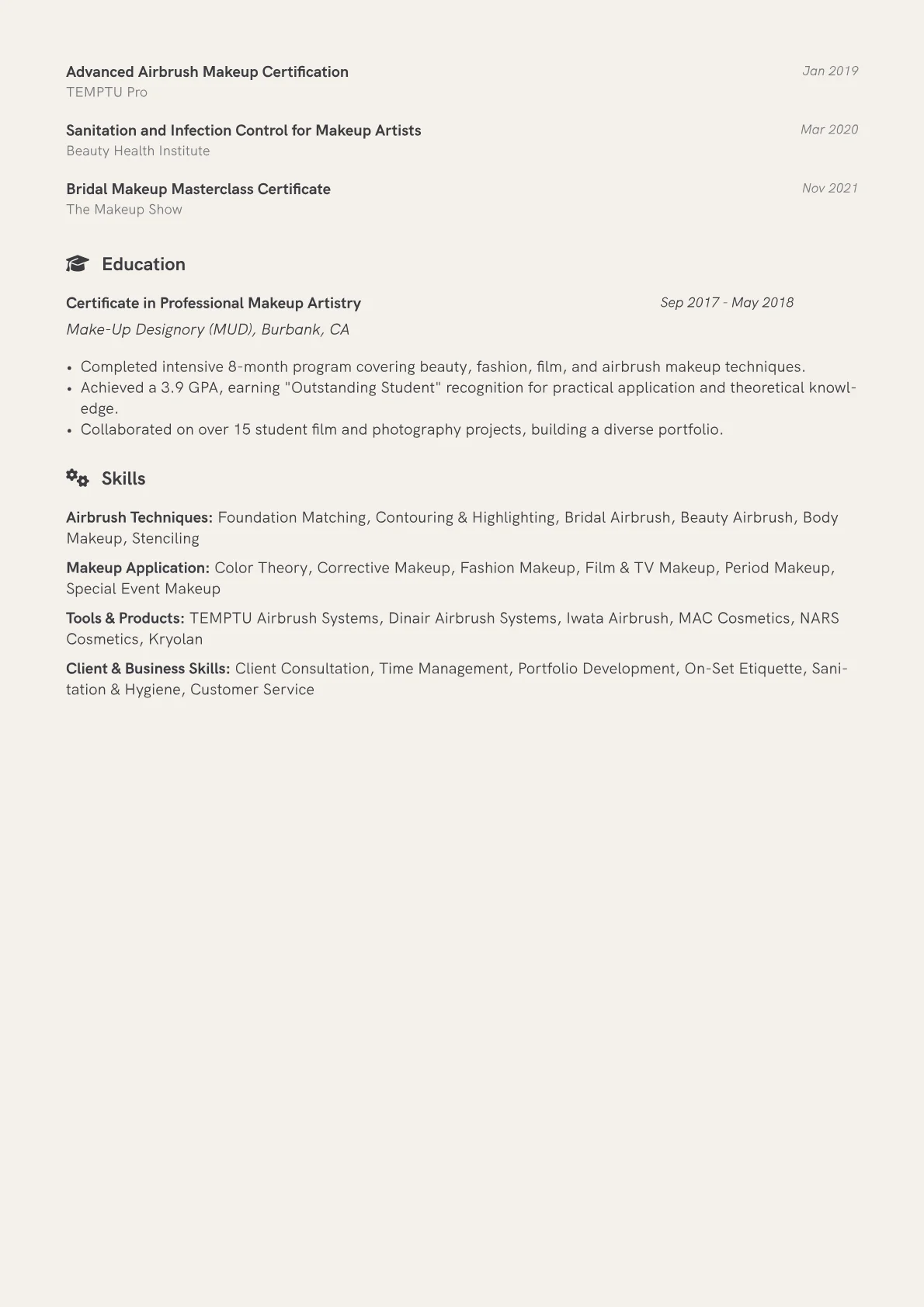 This example resume effectively highlights an Airbrush Makeup Artist's capabilities through clear, quantified achievements. Skills are thoughtfully grouped into technical proficiencies, such as "Advanced Airbrush Techniques" and "Product Formulation Knowledge," alongside essential soft skills like "Client Consultation" and "On-Set Etiquette." The template also prominently features relevant certifications and specialized tools, ensuring hiring managers quickly identify expertise with industry-standard equipment and techniques. A dedicated section for a portfolio link provides direct access to visual proof of artistry, a critical component for this role.