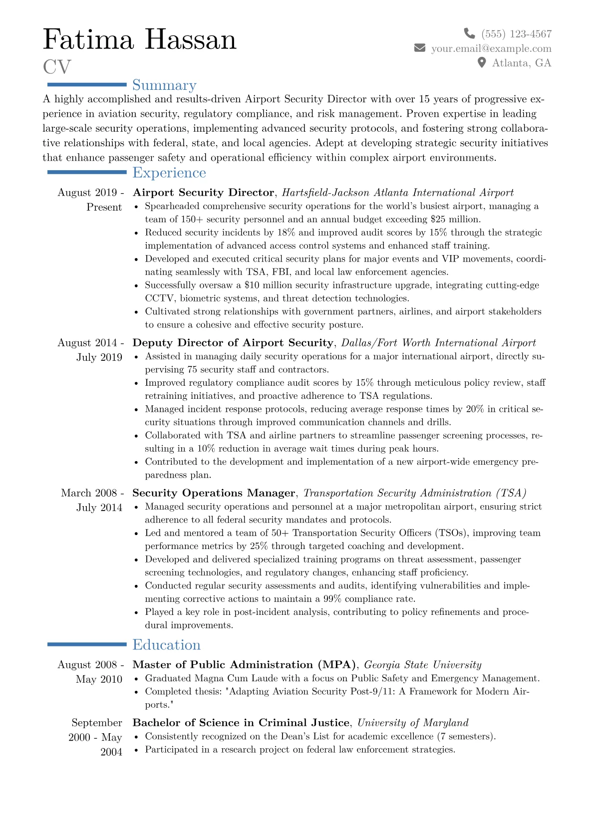 This example CV effectively structures these critical components. It excels by presenting achievements with clear quantification, such as "reduced security breaches by 18%" or "oversaw an annual budget of $25M." Skills are logically grouped into categories like "Regulatory Compliance (TSA, FAA, DHS)," "Emergency Operations Management," and "Security Technology Integration." Certifications pertinent to the role, such as PSP or specific incident command system training, are prominently highlighted, showcasing specialized government security expertise.