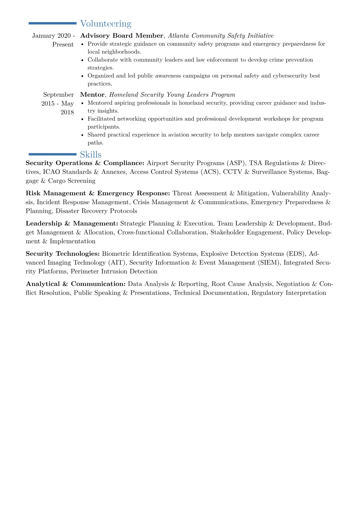 This template was built with JobSprout and can be remixed to create your own tailored Airport Security Director resume, reflecting your unique experience and qualifications.