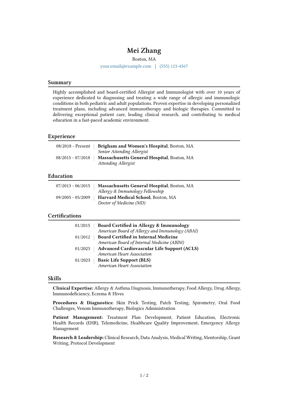 This example CV effectively highlights a senior Allergist's capabilities by quantifying achievements, such as managing a diverse patient panel of over 500 individuals and optimizing clinic flow to reduce wait times by 15%. Clinical skills are clearly grouped to showcase expertise in areas like advanced allergy diagnostics, personalized immunotherapy, and anaphylaxis emergency protocols. It prominently displays critical certifications, including ABAI board certification, and lists specific medical technologies and EMR platforms utilized. The structure ensures a focus on both clinical excellence and leadership within a healthcare setting.