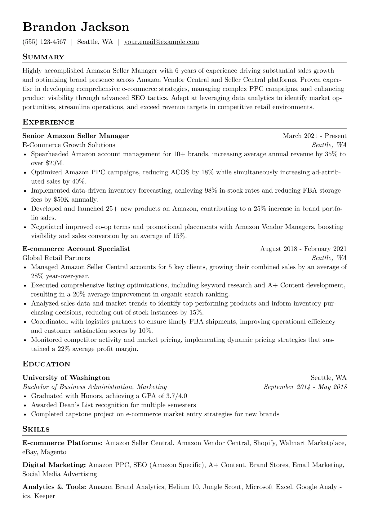 This template was built with JobSprout and can be remixed to create your own tailored Amazon Seller Manager resume.