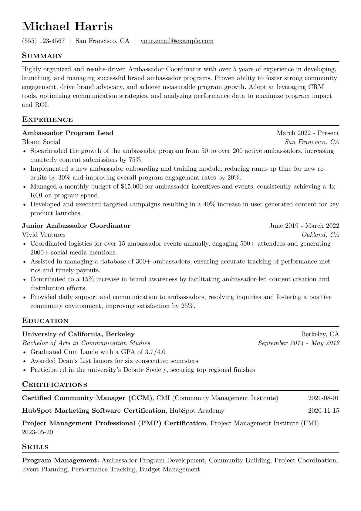This example CV excels by clearly segmenting skills, dedicating sections to "Program Development & Execution" and "Community Engagement." Quantified achievements are prominently displayed, illustrating impact with precise numbers, such as "orchestrated recruitment of 75 brand ambassadors, enhancing reach by 30%." Key software proficiencies like Salesforce or Slack are clearly listed under a "Tools & Platforms" section, showing direct relevance to the role's operational demands. The resume effectively showcases a mid-level professional's capability to manage and motivate a dispersed team.