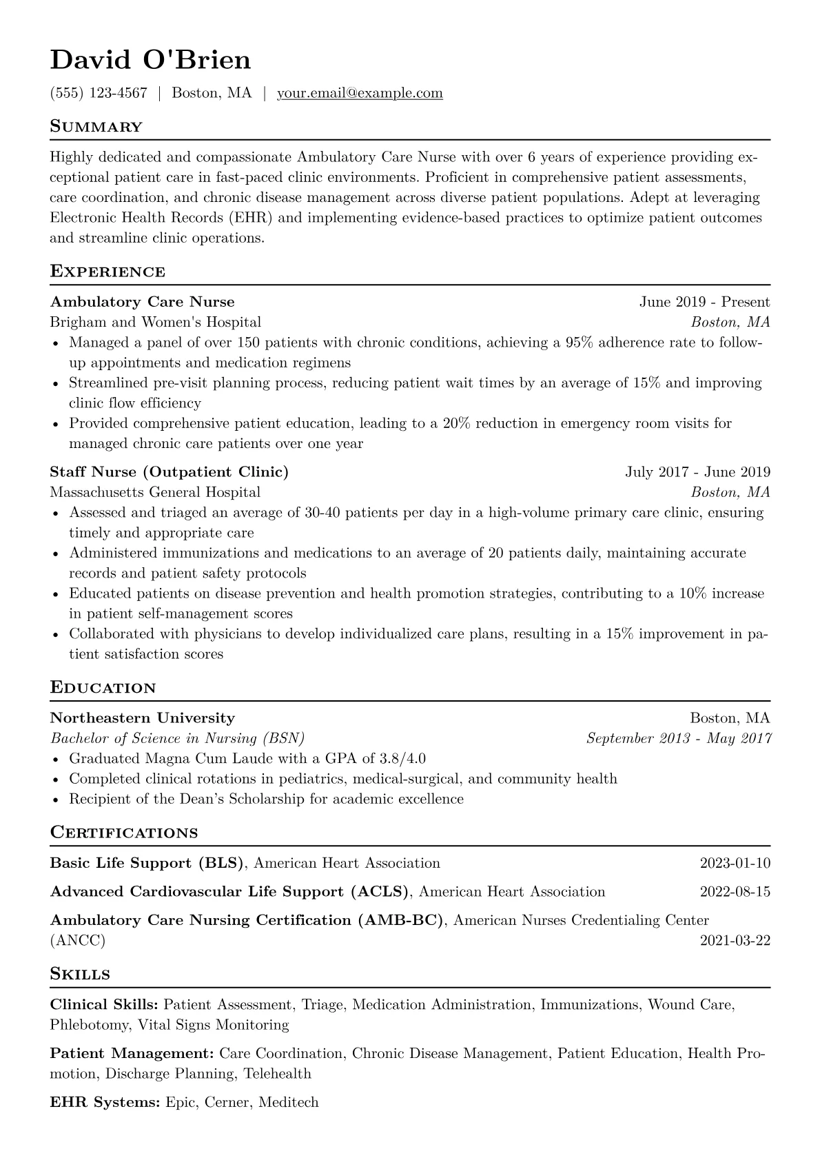 This tailored template was built with JobSprout and serves as an excellent foundation to create your own effective Ambulatory Care Nurse resume. It allows for easy customization to reflect your unique experience and career aspirations.