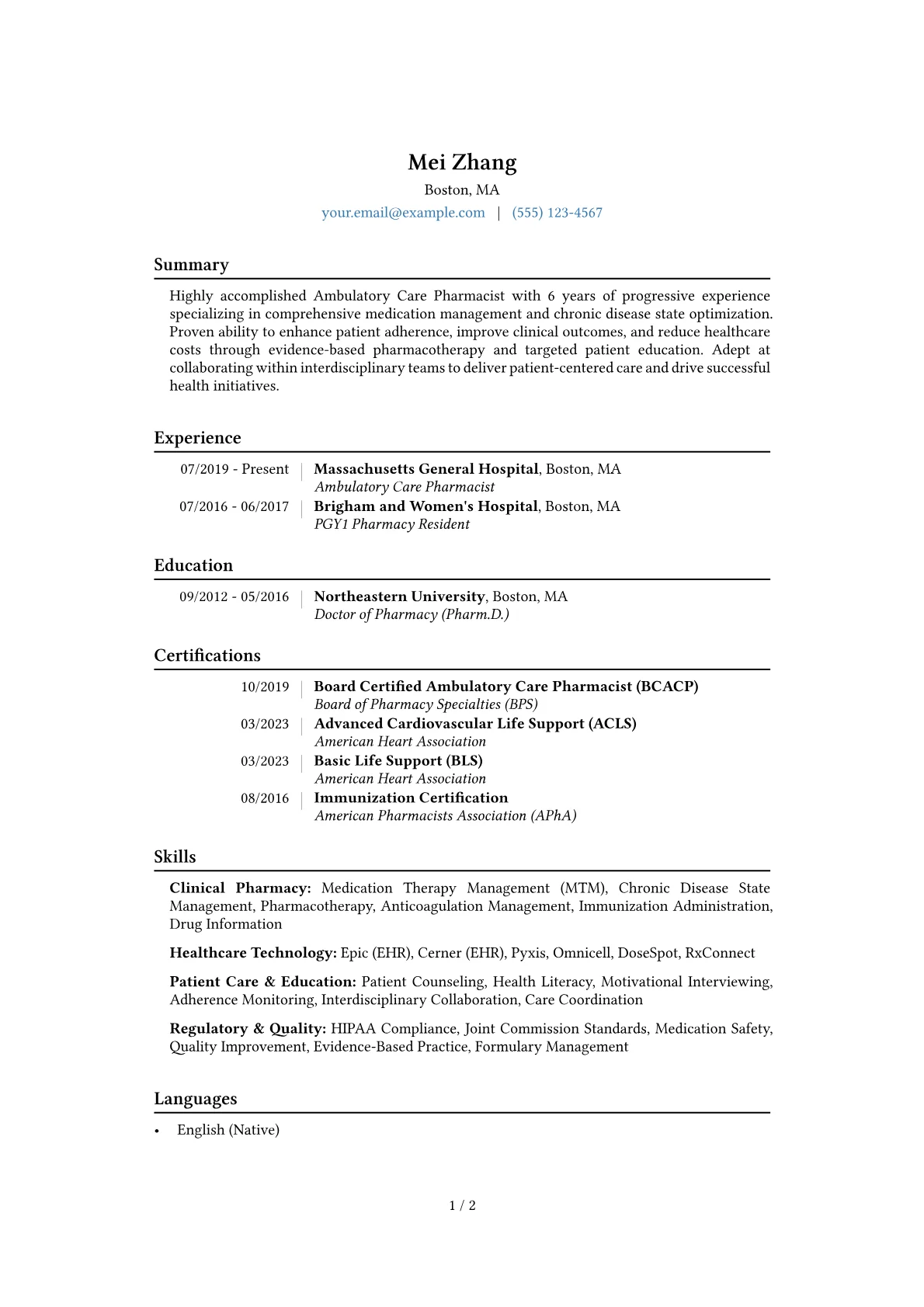 This example CV effectively structures an Ambulatory Care Pharmacist's qualifications. Achievements are strongly quantified, often detailing specific patient panel sizes or measurable health improvements, which directly showcases impact. Clinical skills are logically grouped, separating areas like pharmacotherapy optimization and patient counseling from technical proficiencies with EHR systems such as Epic or Cerner. The resume prominently features relevant certifications like BCACP, placing them where recruiters can easily identify advanced specializations crucial for the role.