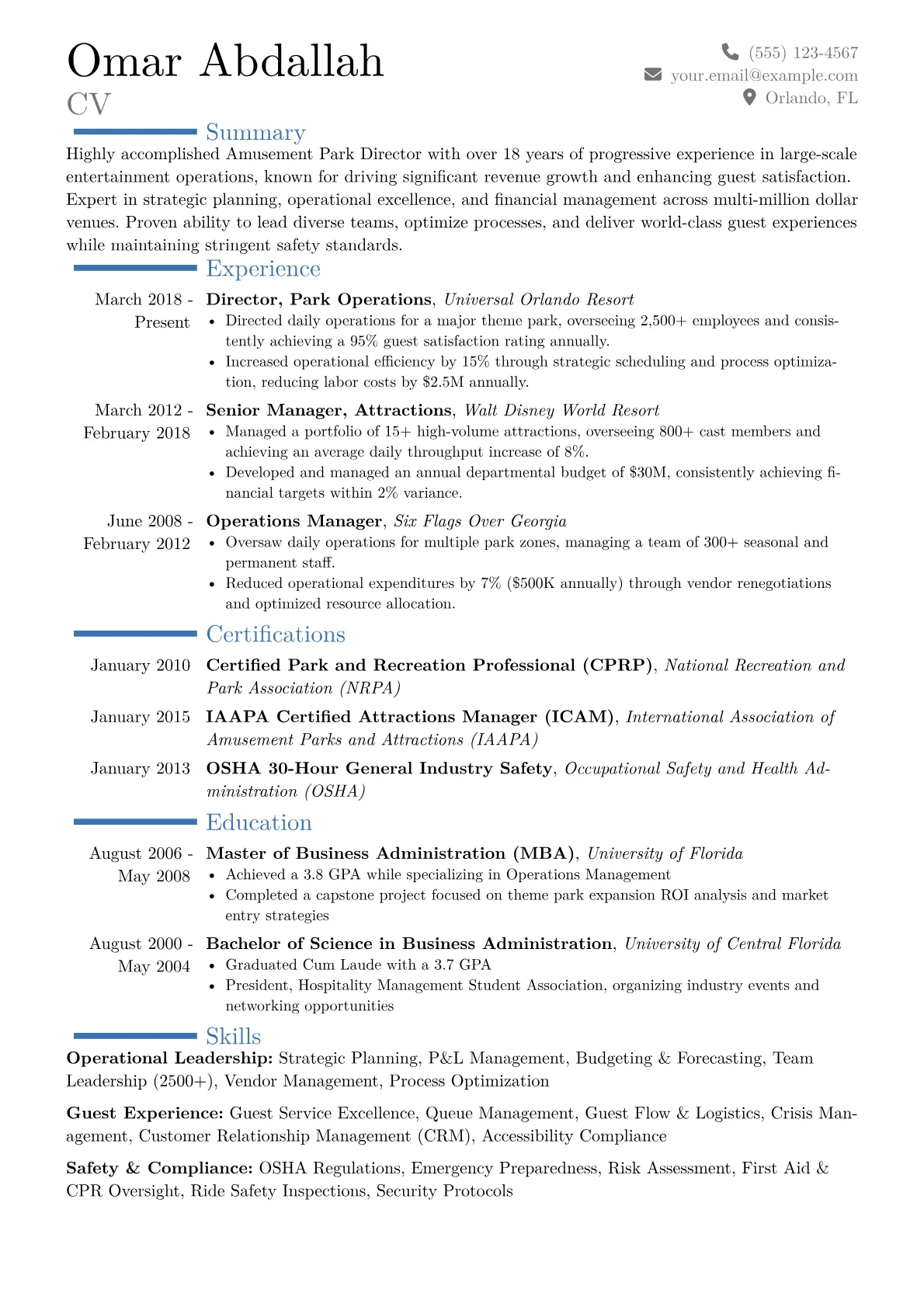 The featured resume example effectively showcases these critical elements by quantifying achievements, such as increasing annual park attendance by X% or boosting F&B revenue by Y%. Skills are thoughtfully grouped under categories like "Operational Leadership," encompassing safety, guest relations, and facility management, and "Strategic Growth," covering marketing, attraction development, and financial planning. Furthermore, specific certifications, such as those from IAAPA, alongside experience with advanced ticketing systems or ride management software, are prominently highlighted, making the candidate's technical and industry-specific prowess undeniable.