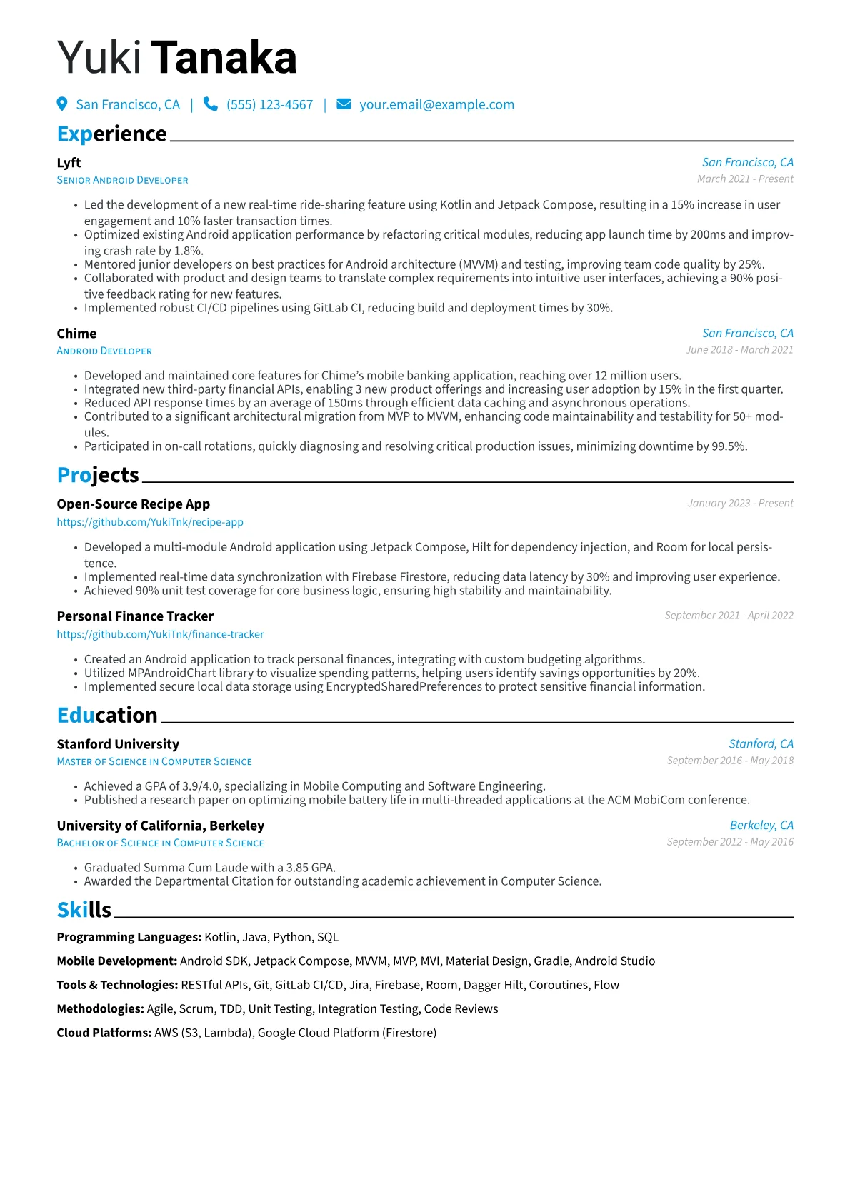 This example resume excels by quantifying achievements and grouping technical skills effectively. It highlights specific contributions like increasing app stability or improving load times, demonstrating clear business impact. Relevant certifications and a well-structured skills section quickly communicate proficiency in areas such as Jetpack Compose, Dagger, and API integration, making it easy for recruiters to identify key competencies.