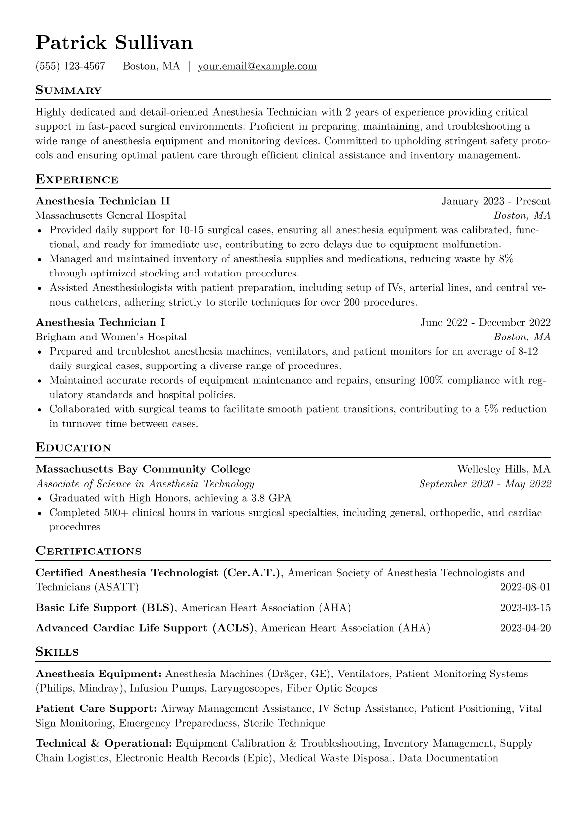 This exemplary template was thoughtfully designed using JobSprout, offering a robust foundation. Users can easily remix and tailor it to construct their own highly effective Anesthesia Technician resume.