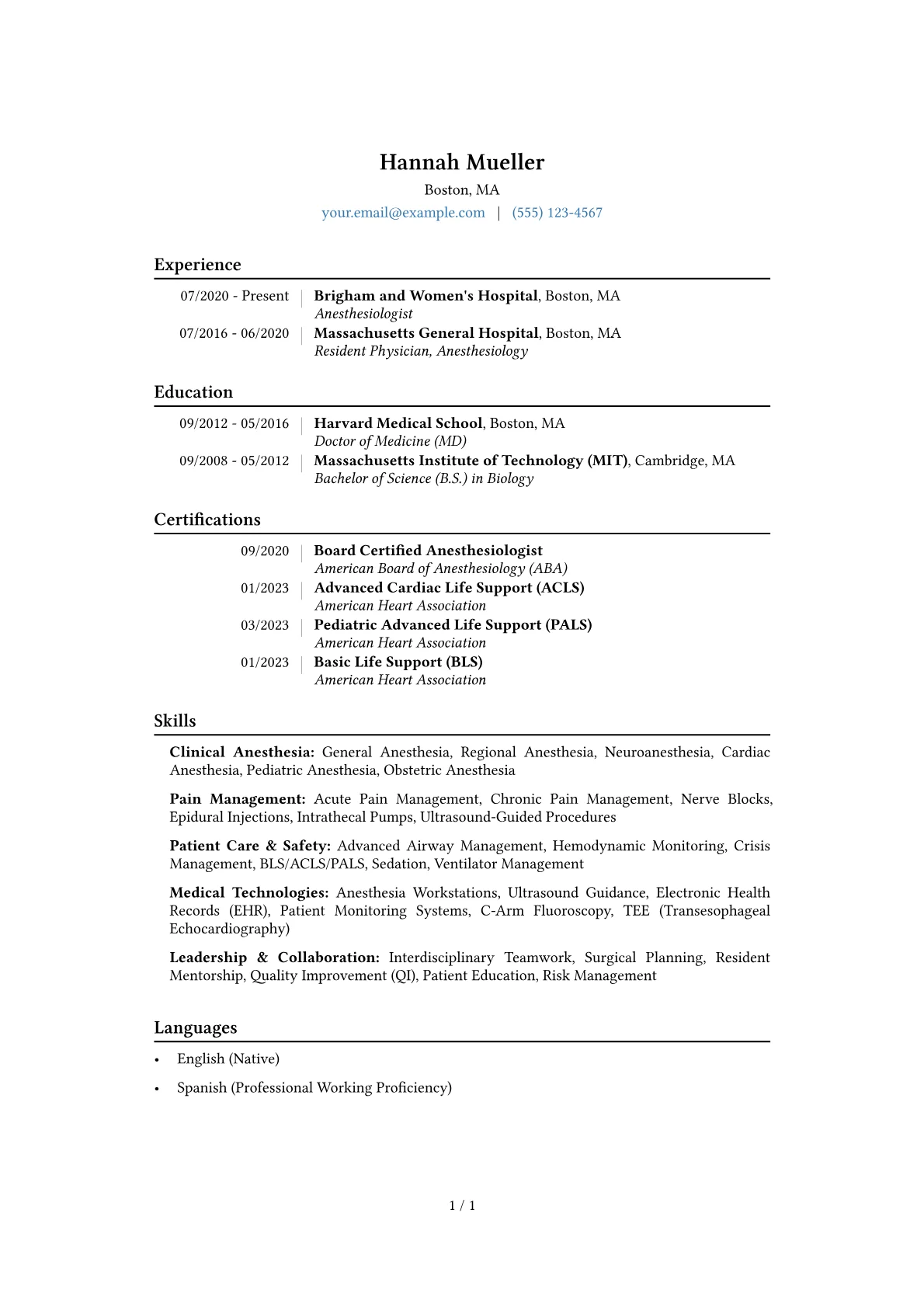This template was built with JobSprout and can be remixed to create your own tailored Anesthesiologist resume. Utilize its structure to effectively present your unique professional journey.