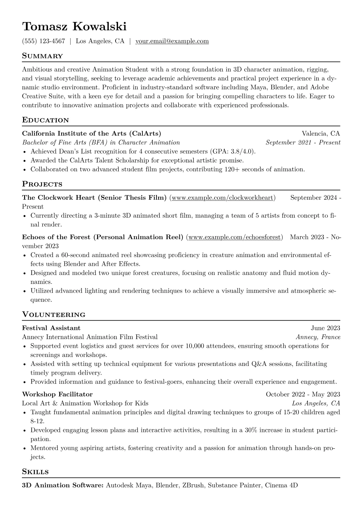 This template was built with JobSprout and can be remixed to create your own tailored Animation Student resume. It provides an excellent framework for presenting your creative and technical abilities.