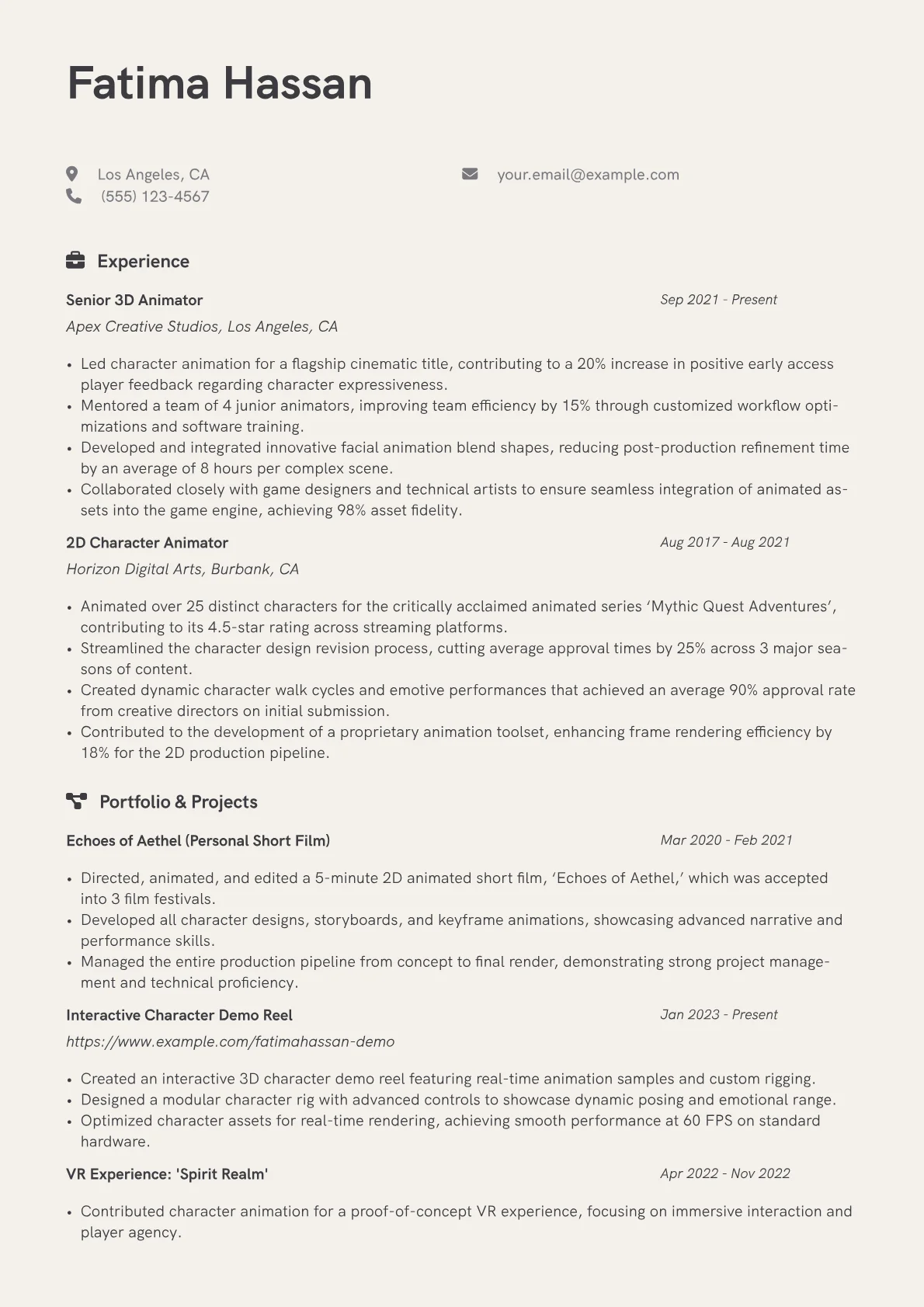 This template was built with JobSprout and can be remixed to create your own tailored Animator resume. It provides a robust framework to highlight your unique skills and project experience.