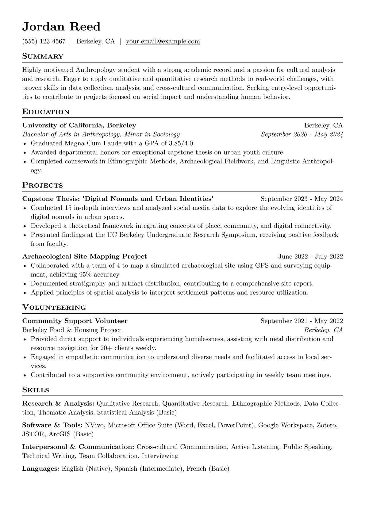This template was built with JobSprout and can be remixed to create your own tailored Anthropology Student resume. It provides a robust framework to highlight your specialized skills and achievements effectively.