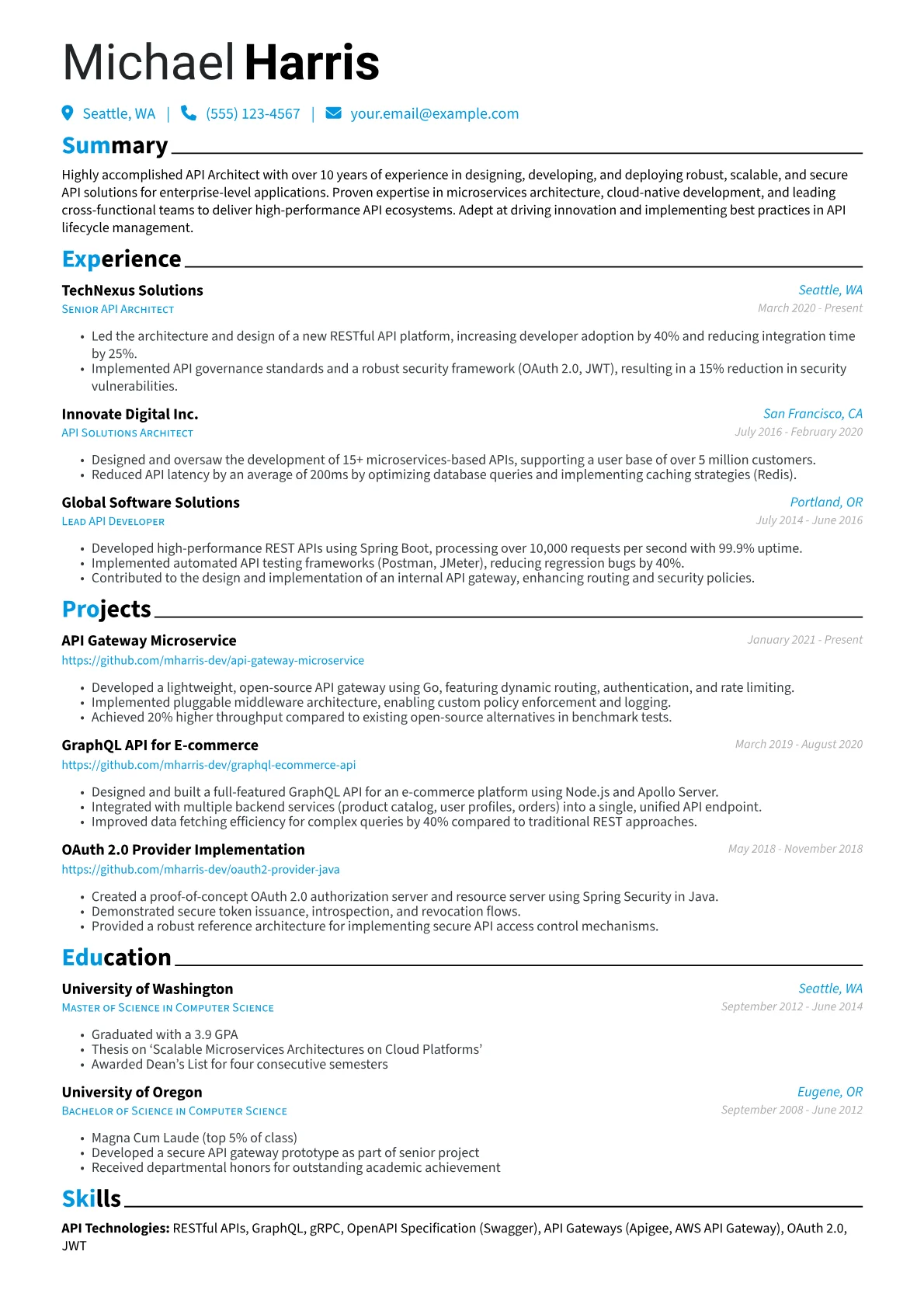This example CV excels by segmenting skills into digestible categories like "API Design Protocols," "Cloud Platforms," and "Security Architectures," allowing immediate assessment of an architect's breadth. Achievements are effectively quantified, for instance, "Spearheaded migration of legacy SOAP services to RESTful APIs, improving integration efficiency by 35% for enterprise partners" or "Engineered API solutions supporting 50M+ daily transactions with 99.99% uptime." The resume highlights proficiency with specific tools and frameworks critical to API architecture, such as Kafka, Kubernetes, and API management platforms, showcasing deep operational experience rather than just theoretical knowledge.