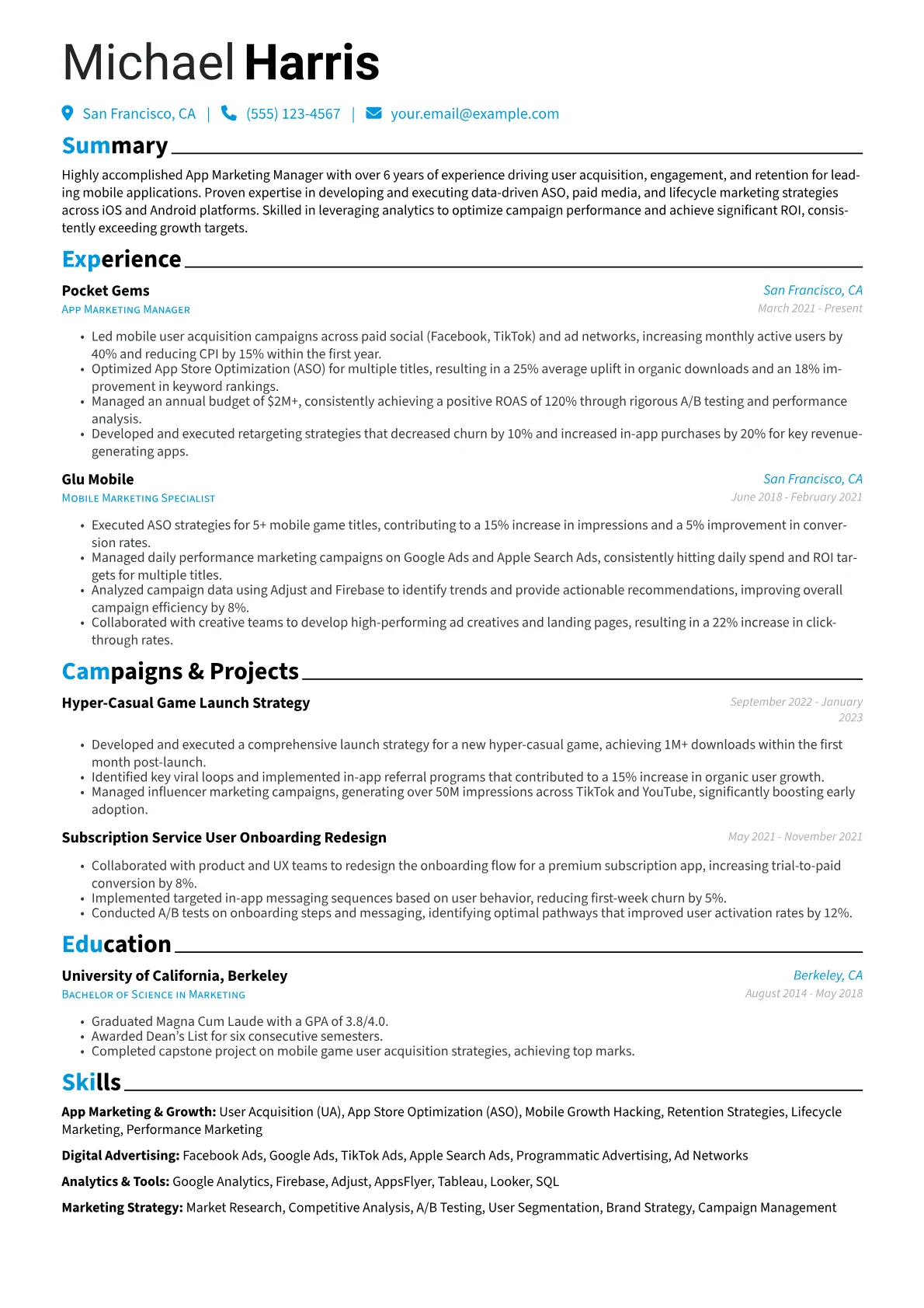 The JobSprout example effectively showcases these critical elements. It quantifies achievements like boosting app installs by 30% while reducing CPI by 15%, directly addressing what recruiters seek. Skills are clearly grouped into categories such as 'UA Platforms' (e.g., Google Ads, Meta Ads) and 'ASO Tools' (e.g., Sensor Tower, AppTweak), immediately communicating proficiency. Certifications and key analytics platforms, like Firebase or Adjust, are prominently highlighted, underscoring specialized expertise vital for this role.