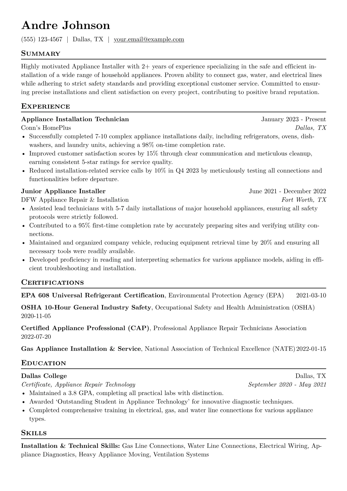 This template was built with JobSprout and can be remixed to create your own tailored Appliance Installer resume.