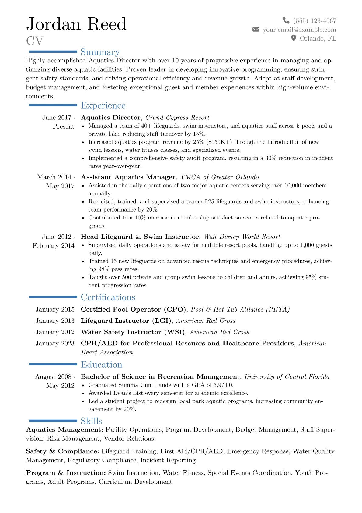 This template was built with JobSprout and can be remixed to create your own tailored Aquatics Director resume. Start building your professional application today.