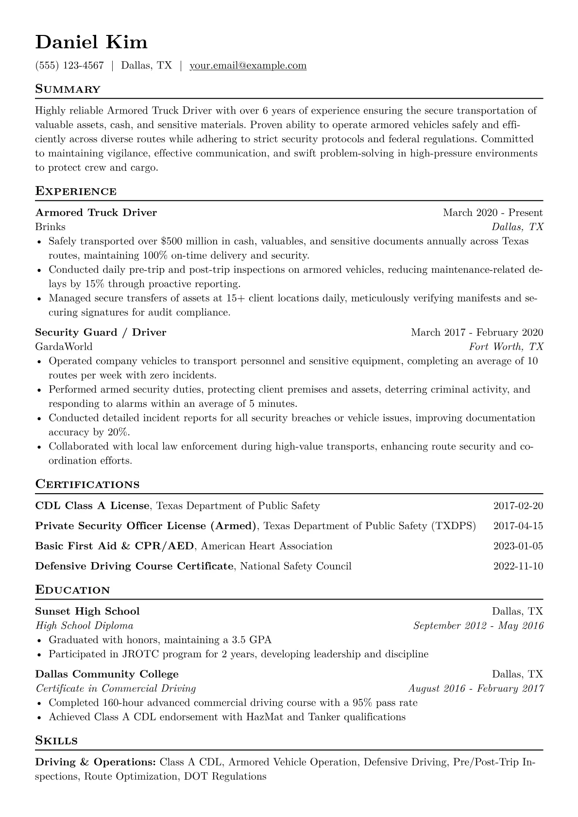 This template was built with JobSprout and can be remixed to create your own tailored Armored Truck Driver resume.