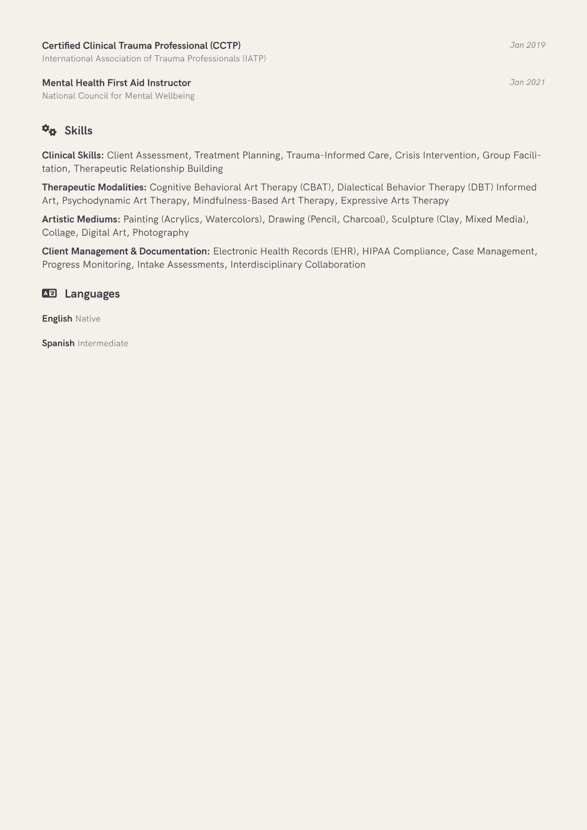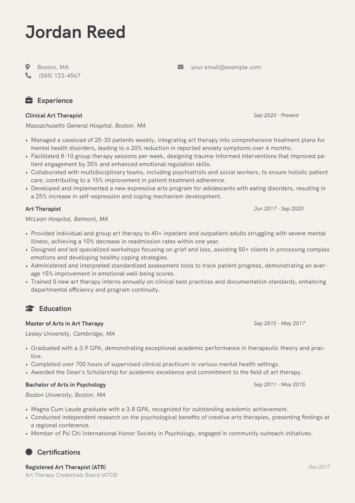 This JobSprout example excels by prominently featuring relevant certifications like ATR or ATR-BC, immediately establishing credibility. Its strategic skills grouping clearly separates clinical competencies from artistic modalities, showcasing a well-rounded profile. The inclusion of quantified achievements, such as "improved patient engagement by 30%," effectively translates therapeutic interventions into tangible results that healthcare administrators value.