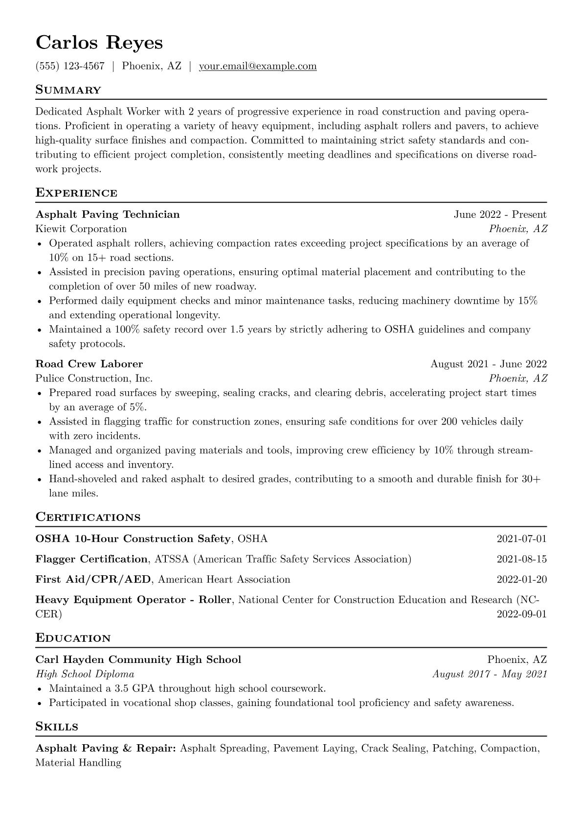 This template was built with JobSprout and can be remixed to create your own tailored Asphalt Worker resume. Customize it to reflect your unique skills and accomplishments.