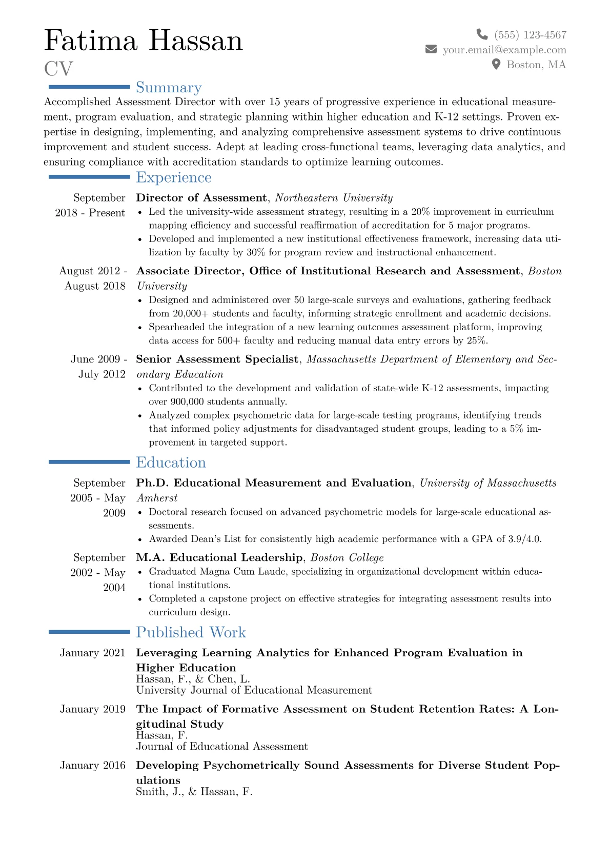 This example resume effectively highlights an Assessment Director's executive-level contributions by clearly quantifying results in key areas. Achievements are prominently displayed, such as "Reduced assessment reporting cycle by 20% through process optimization" or "Secured 100% compliance with regional accreditation standards for two consecutive cycles." Specialized skills like psychometric analysis, program evaluation, and specific data visualization tools (e.g., Tableau, Power BI) are grouped distinctly. Certifications in project management or advanced analytics, if present, are also well-integrated, providing specific evidence of professional development relevant to the role.