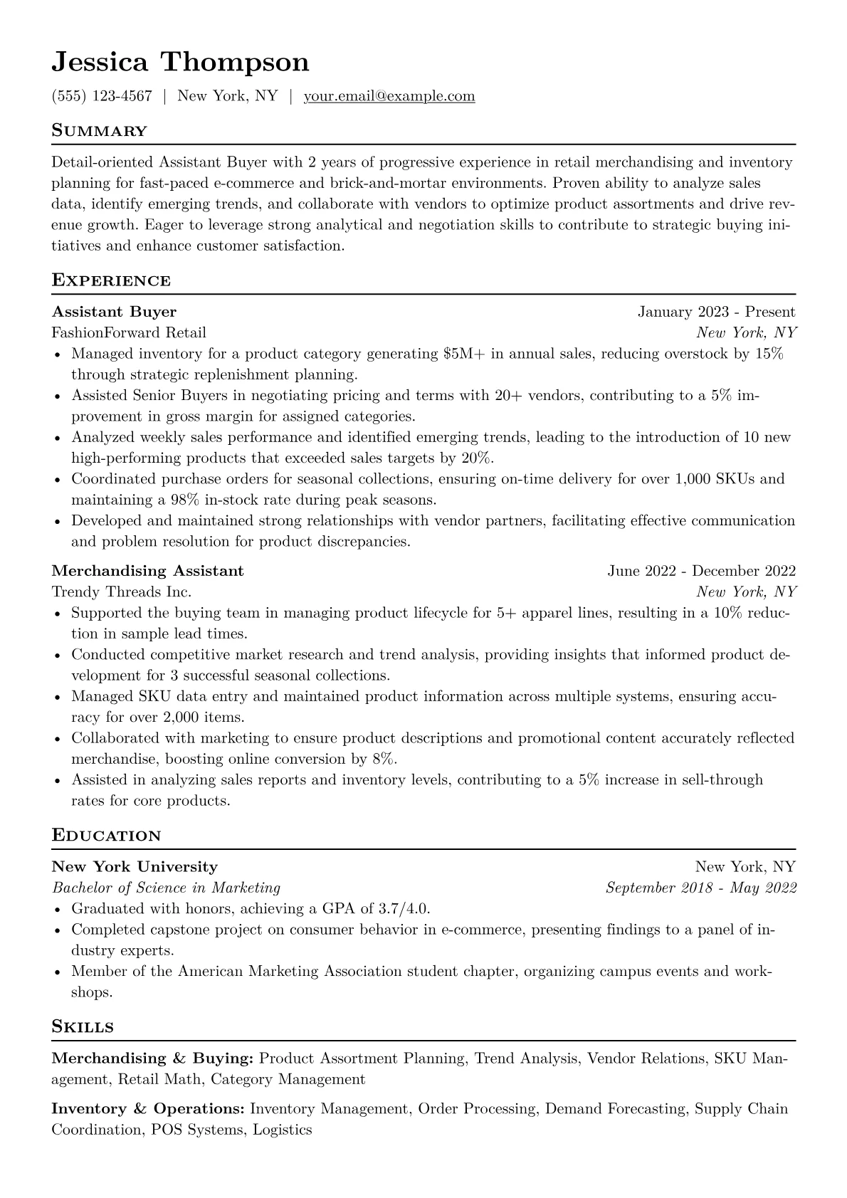 This template was built with JobSprout and can be remixed to create your own tailored Assistant Buyer Retail resume.