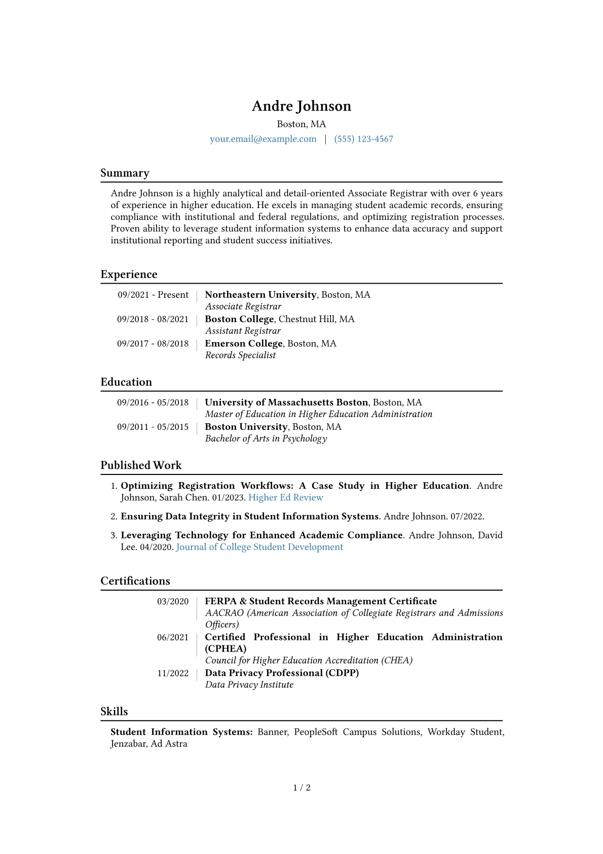 An impactful Associate Registrar resume in education clearly showcases expertise in critical administrative functions and regulatory compliance. Hiring managers specifically seek candidates adept at managing student records, performing degree audits, overseeing course registration, and ensuring data integrity within an SIS like Banner or Jenzabar. Achievements should highlight improvements in processing efficiency, successful implementation of new academic policies, or quantifiable error reductions in student data management. Deep familiarity with FERPA regulations and an ability to streamline complex administrative workflows are highly valued.