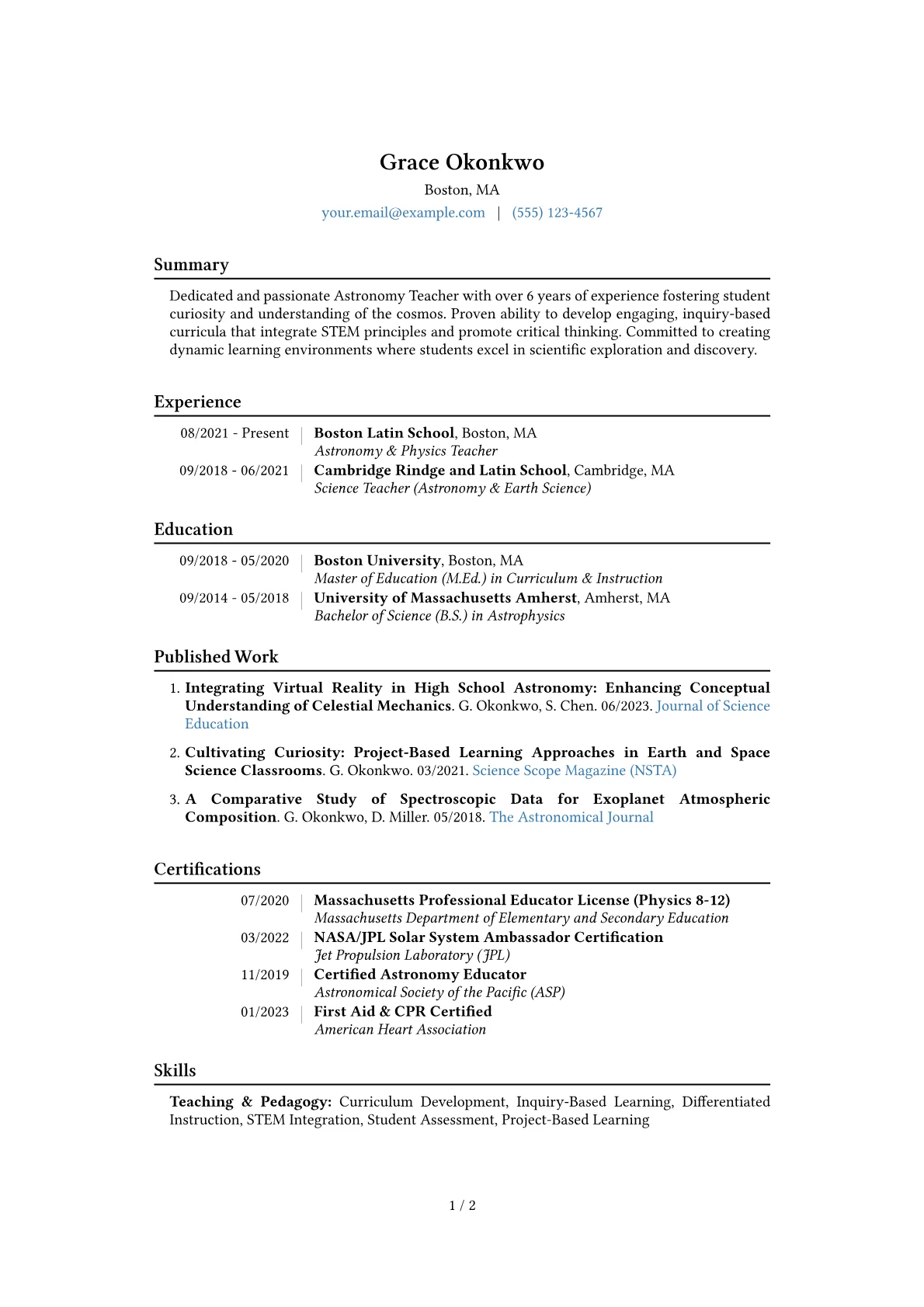 This template was built with JobSprout and can be remixed to create your own tailored Astronomy Teacher resume. It provides an excellent framework for presenting your unique qualifications.