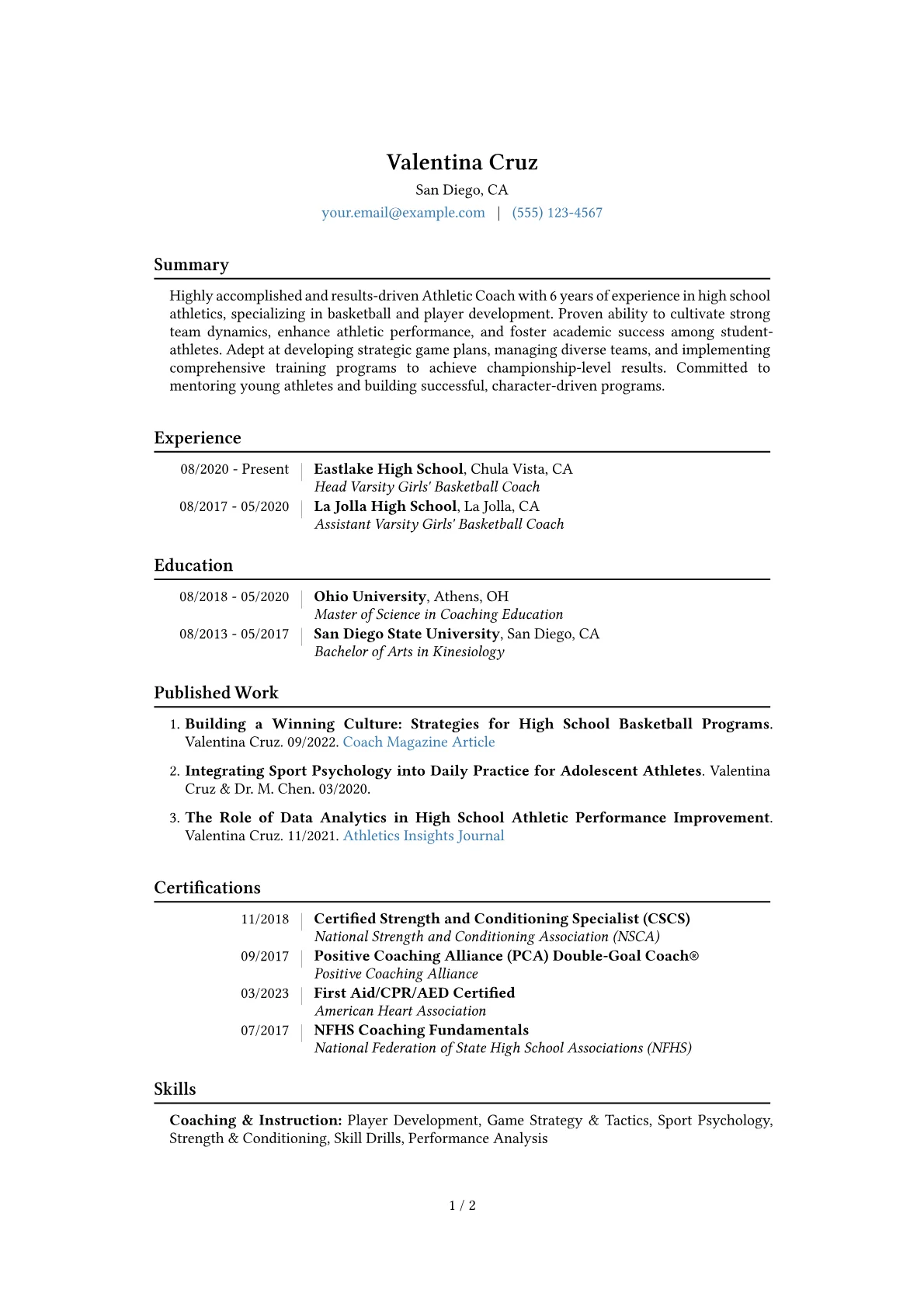 For an Athletic Coach High School role, hiring managers in Education highly value a resume that showcases tangible impacts on both athletic performance and student development. Strong candidates highlight achievements like improving team win percentages, fostering a positive team culture, and ensuring academic eligibility for athletes. Essential components include certifications such as CPR First Aid and sport specific coaching credentials, alongside specific terminology like "athlete welfare protocols," "skill progression frameworks," and "team cohesion initiatives." The role demands a blend of competitive drive and a genuine commitment to mentorship.