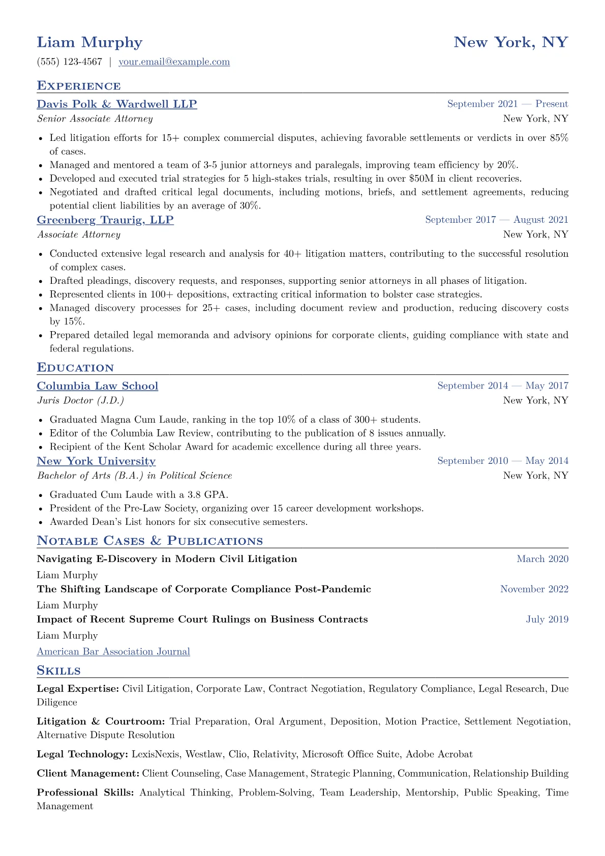 Hiring managers evaluating mid-level attorney resumes prioritize specific, quantifiable achievements over general statements. They look for evidence of successful case management, favorable outcomes in litigation or negotiation, and strong client advocacy. Key details include bar admissions, specific court experience (e.g., federal district court, appellate), expertise in practice areas like corporate transactions, intellectual property, or regulatory compliance, and proficiency with eDiscovery tools or legal research platforms such as LexisNexis. Clarity on case types handled, motions drafted, and contracts negotiated is essential.