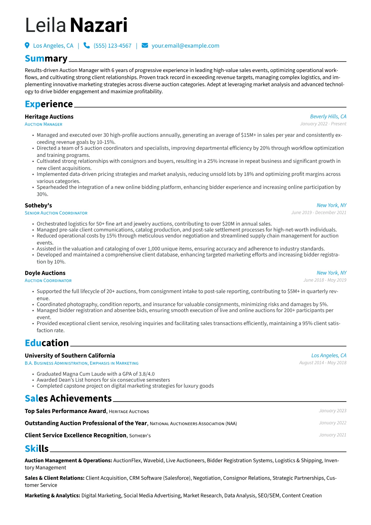 This template was built with JobSprout and can be remixed to create your own tailored Auction Manager resume. Customize it to reflect your unique achievements and industry experience.