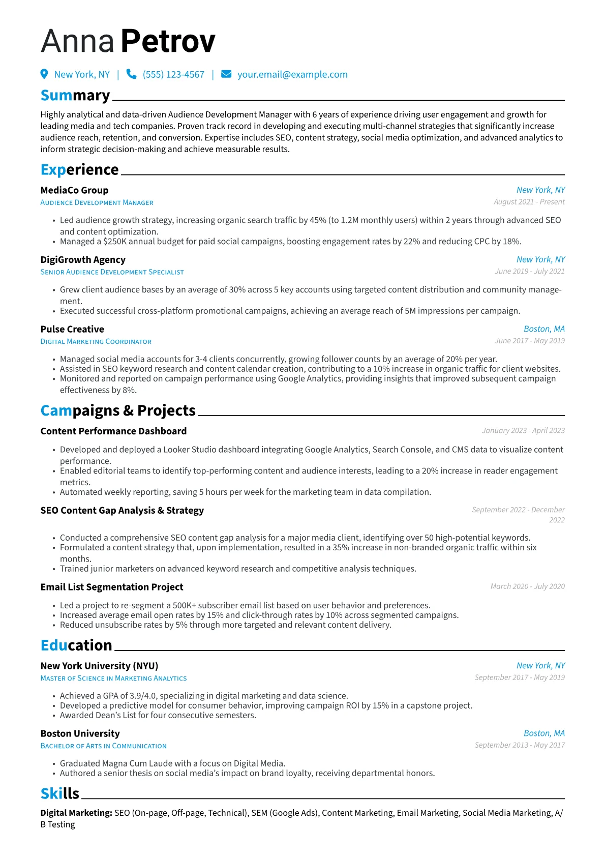 This template was built with JobSprout and can be remixed to create your own tailored Audience Development Manager resume. JobSprout helps articulate your experience for the role you want.