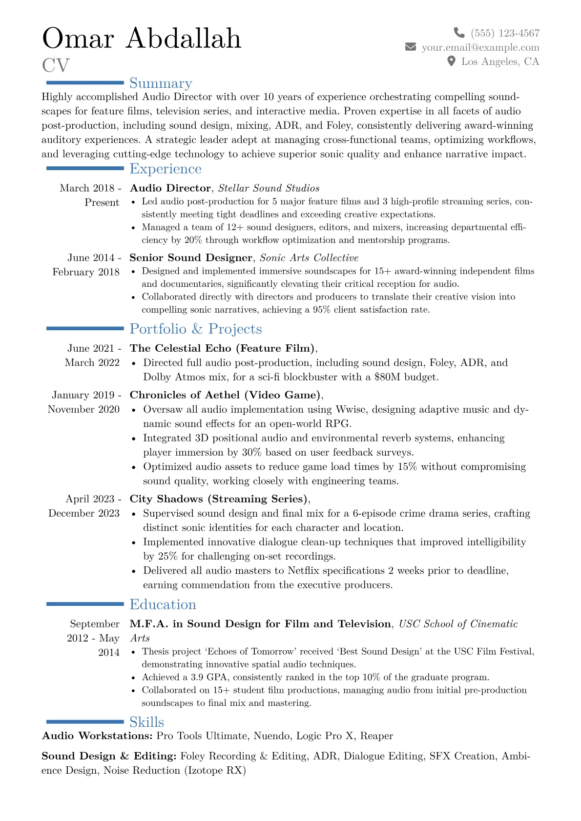 This example CV effectively highlights a senior Audio Director's expertise through its strategic organization. Quantified achievements prominently detail project impact, such as "reduced audio memory footprint by 20% across five major titles" and "led a team of 10 sound designers from concept to ship." Skills are logically grouped into categories like "Technical Audio Design Tools" (Wwise, FMOD Studio, Pro Tools), "Audio Engine Integration," and "Leadership & Pipeline Management," providing an immediate overview of capabilities. Certifications, like Wwise Certified Professional, are clearly listed, affirming specialized knowledge.