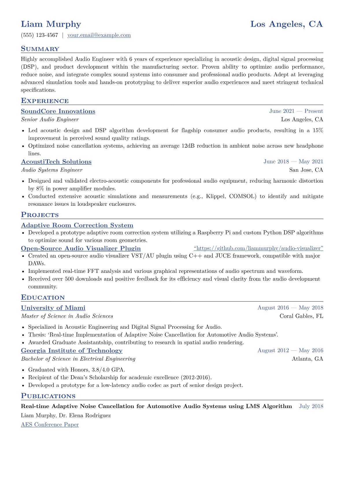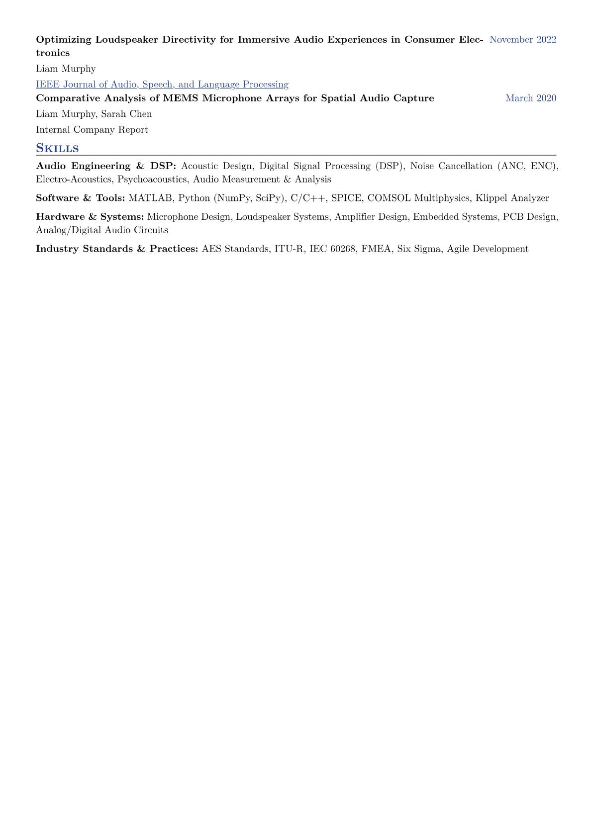 A strong resume for a mid-level Audio Engineer in manufacturing must showcase expertise in industrial acoustics and signal processing, not just creative audio production. Hiring managers in this sector prioritize achievements in areas like acoustic measurement and analysis, noise control engineering for industrial equipment, and robust audio quality assurance protocols on production lines. Critical skills include digital signal processing (DSP), transducer integration, and compliance with industry standards for sound levels or electromagnetic interference. Candidates should emphasize quantified successes such as reducing product acoustic signatures by specific decibels or improving sound testing efficiency.