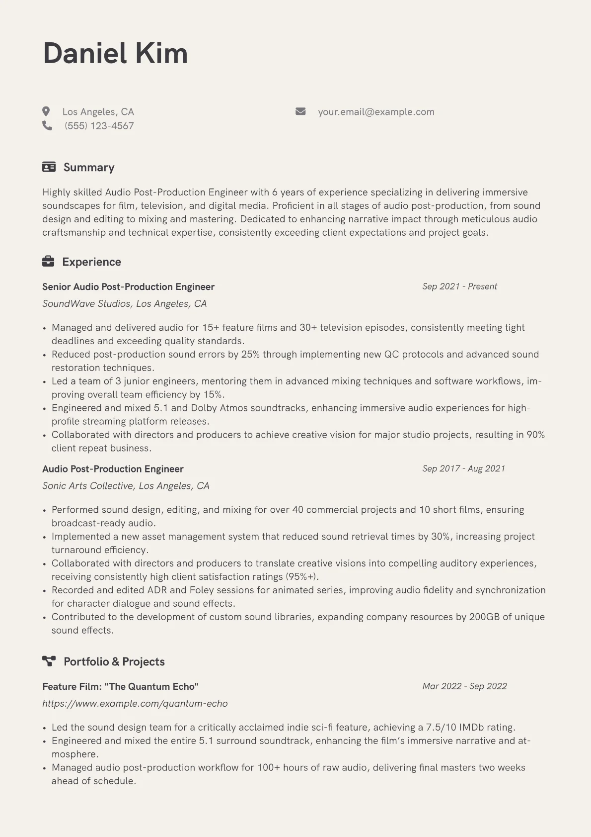 This template was built with JobSprout and can be remixed to create your own tailored Audio Post-Production Engineer resume.