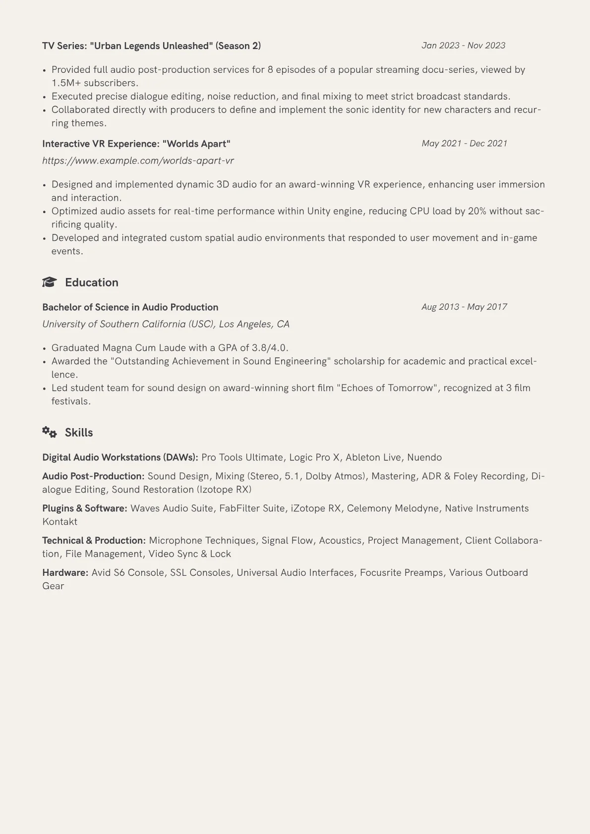 This example CV effectively showcases these critical elements. Achievements are quantified, detailing contributions like "supervised ADR for 3 seasons of a premium drama" or "mastered audio for 10+ mobile game titles, improving user engagement scores." Skills are logically grouped, separating DAWs (e.g., Pro Tools, Nuendo), middleware (e.g., Wwise, FMOD), and plugin suites (e.g., iZotope RX, Waves Diamond). Certifications and specialized tools are prominently highlighted, ensuring immediate visibility of relevant technical expertise for the audio post-production pipeline.