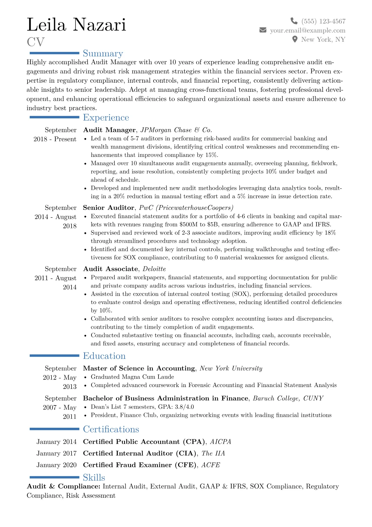 This robust template, built with JobSprout, provides a strong foundation for any Audit Manager to adapt and create their own compelling resume. It offers a clear, professional layout ready for your unique experience.
