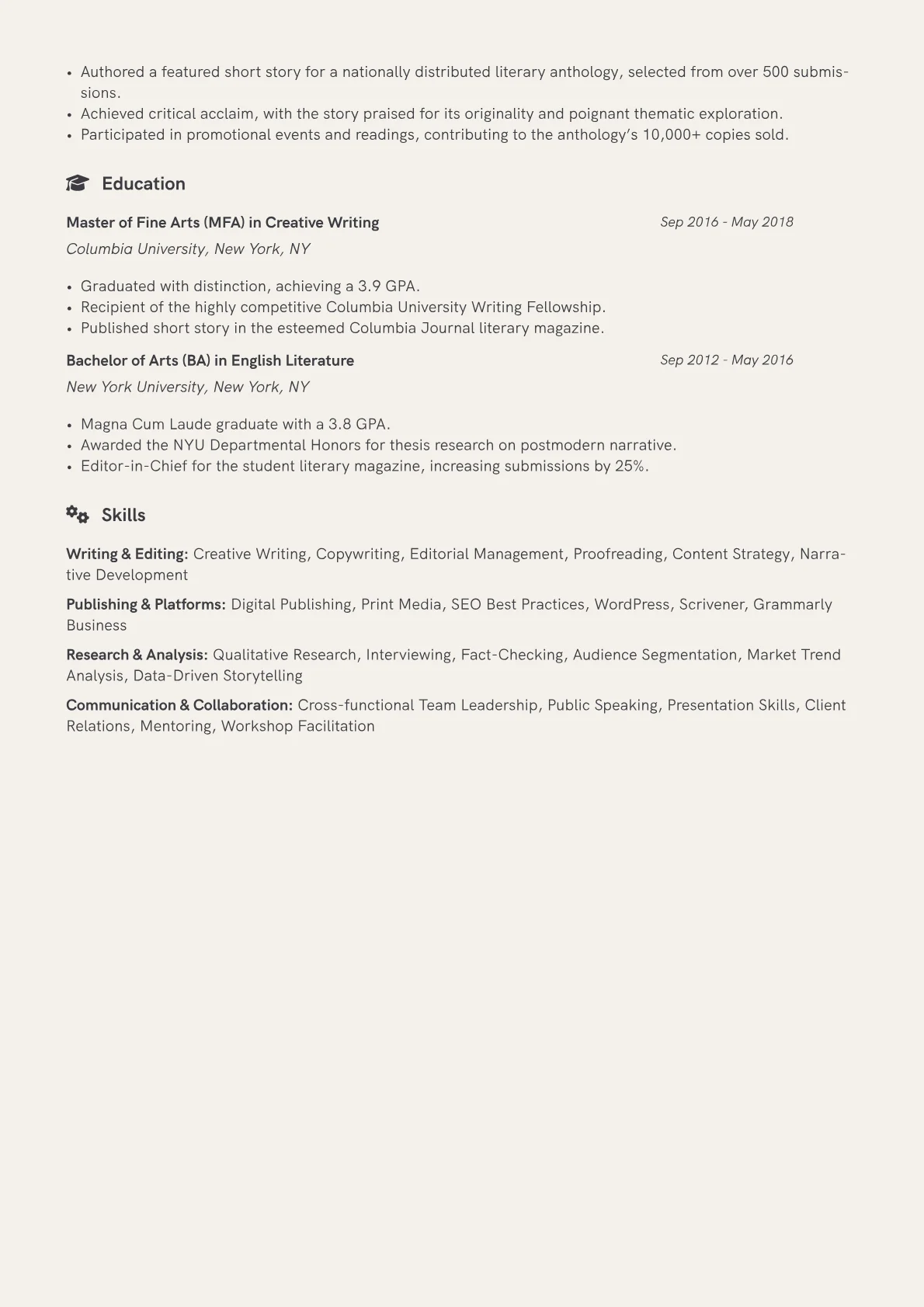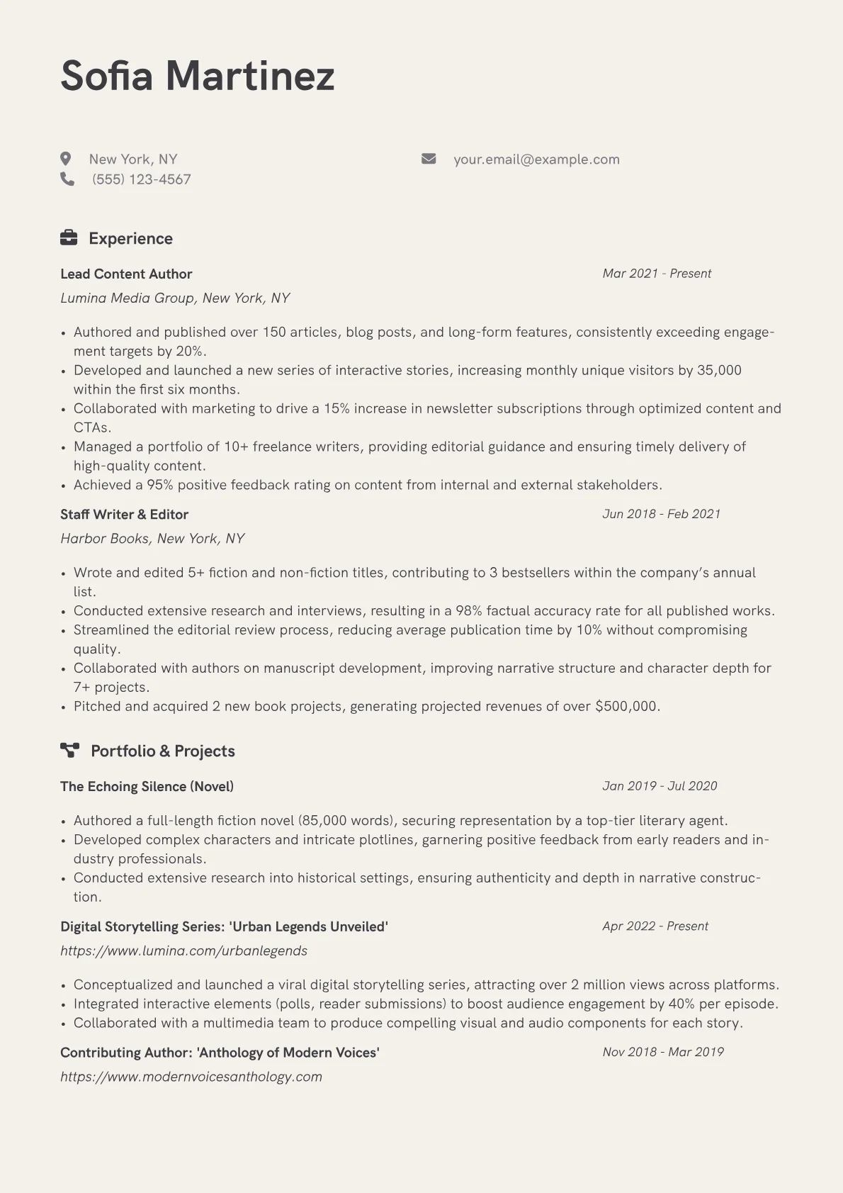 For an Author in Media & Entertainment, a compelling resume showcases not just writing skill, but also a track record of successful content creation and audience engagement. Hiring managers seek evidence of adaptable storytelling, a distinct voice, and the ability to deliver engaging narratives across various platforms. The unique challenge lies in quantifying creative output and succinctly presenting a diverse portfolio of work.